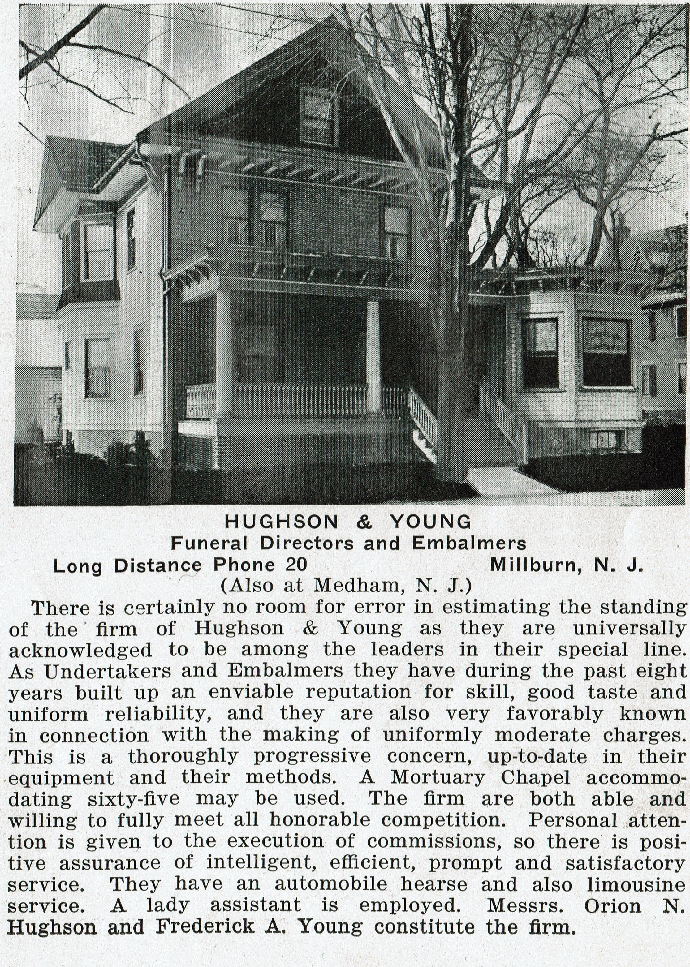Photograph and description of Hughson & Young Funeral Directors and Embalmers from "South Orange, Maplewood, Millburn & Springfield, N.J." New York: G.W. Richardson (undated), belonging to William Mangold (60 Whittingham Terrace, Millburn). See: 2022.236.020.
