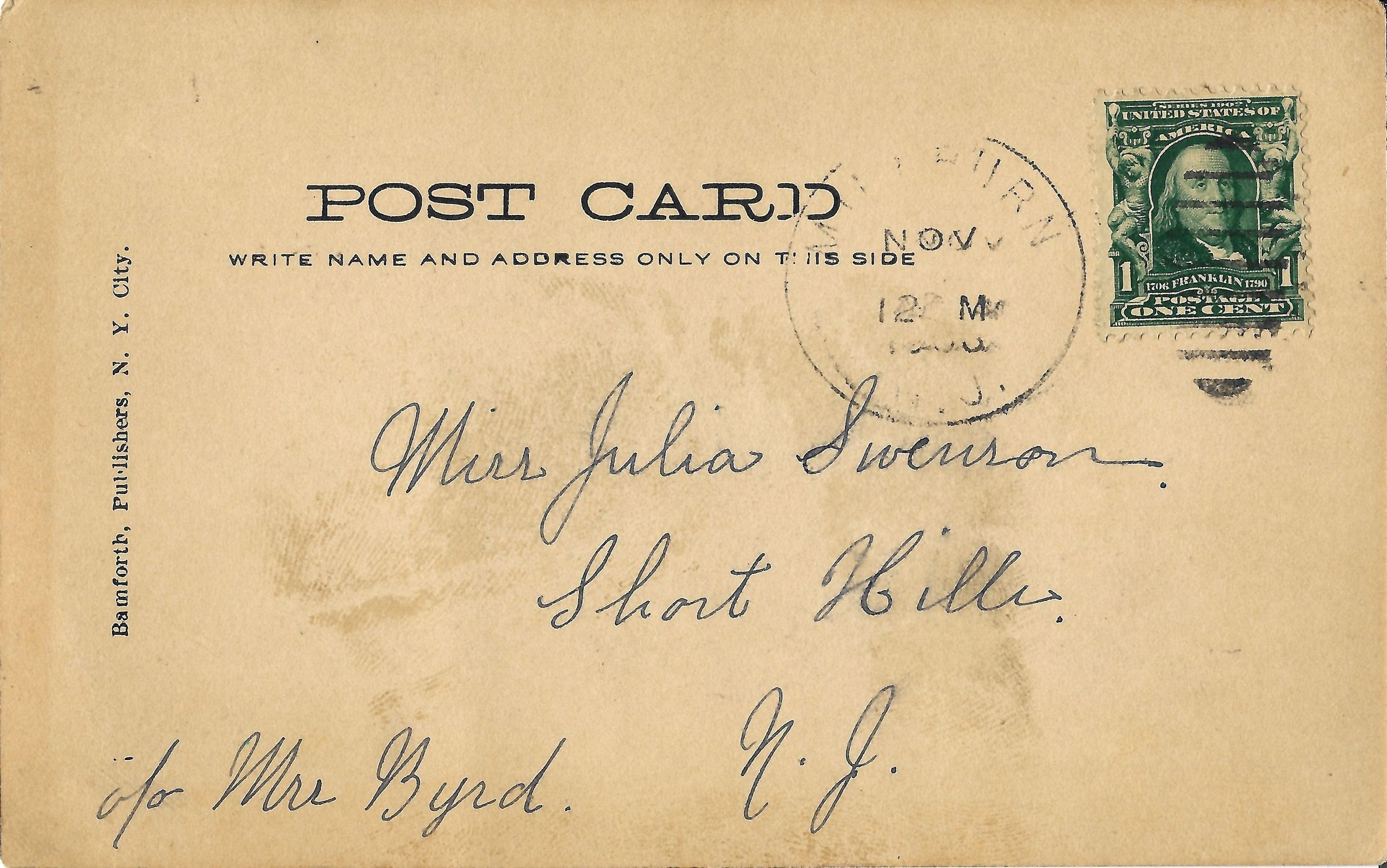 Humorous photographic postcard sent to Miss Julia Swenson, Short Hills, C/O Mrs. Byrd postmarked Millburn, November 12, 1906. Postcard features a man holding a skein of yarn, while a woman rolls it. Text: "He: Would you marry me if I were rich. She: I might! People will do ANYTHING for money."Acquisition