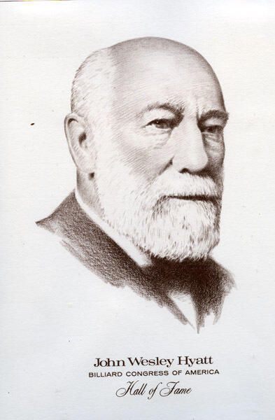 Lithograph of John Wesley Hyatt for the Billiard Congress of America Hall of Fame. John Wesley Hyatt, known as the father of the American plastic industry, was an inventor rather than a player, but his invention of the celluloid plastic billiard ball in 1868 revolutionized the billiard industry. Hyatt began his search for a suitable synthetic billiard ball material when a New York billiards firm offered a $10,000 prize for a substitute for ivory. Hyatt's earlier attempts involved shellacking a paper pulp sphere and a ball made of layers of cloth. Hyatt was inducted into the Billiard Congress Hall of Fame in 1971.Acquisition