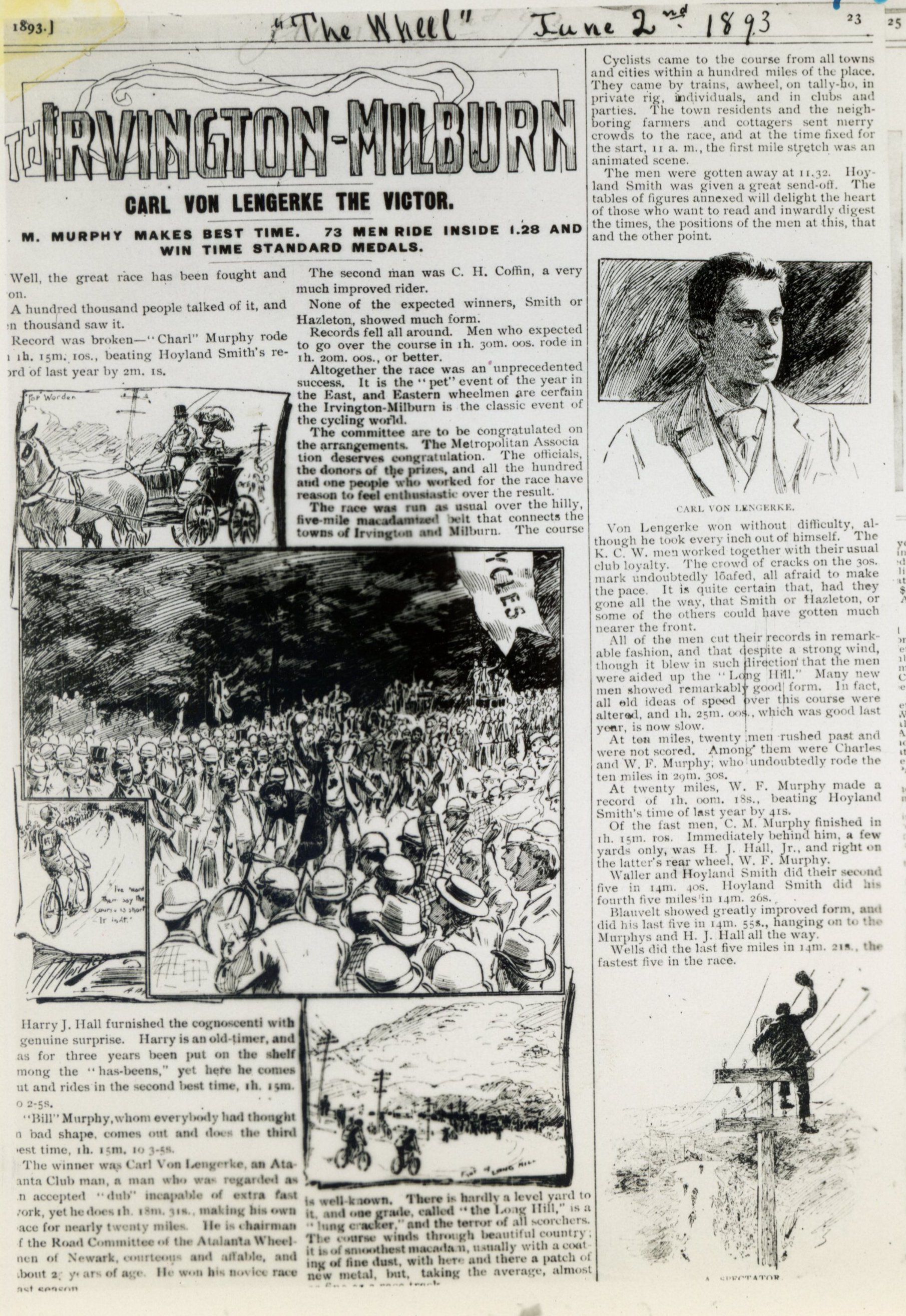 Photograph of the front page of the June 2, 1893 edition of "The Wheel" periodical covering the Irvington-Millburn Road Race and Carl Van Lengerke.Collection