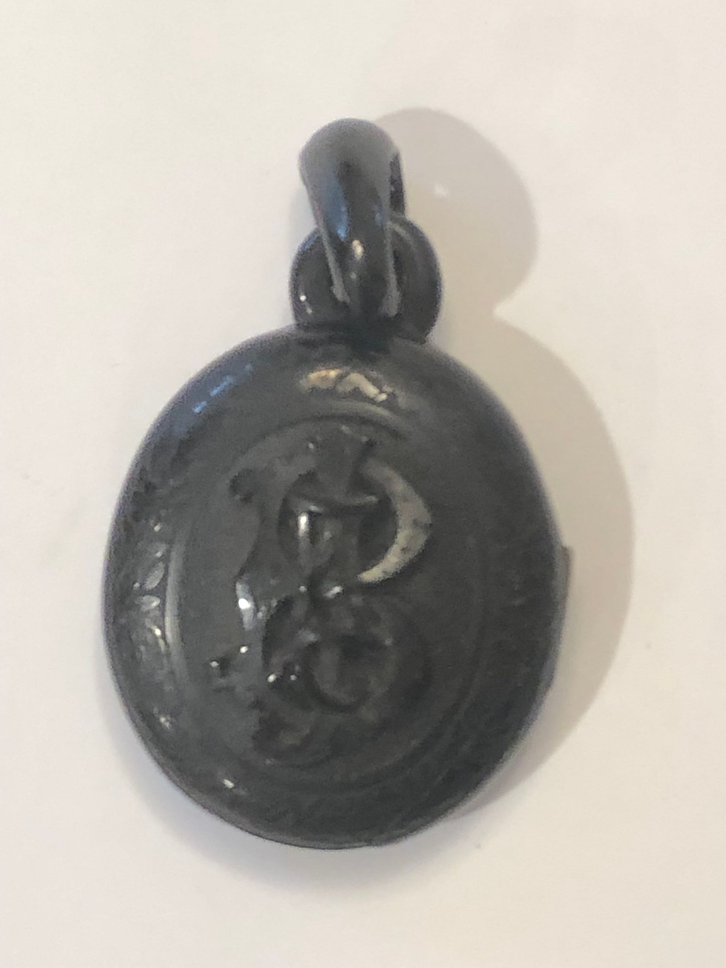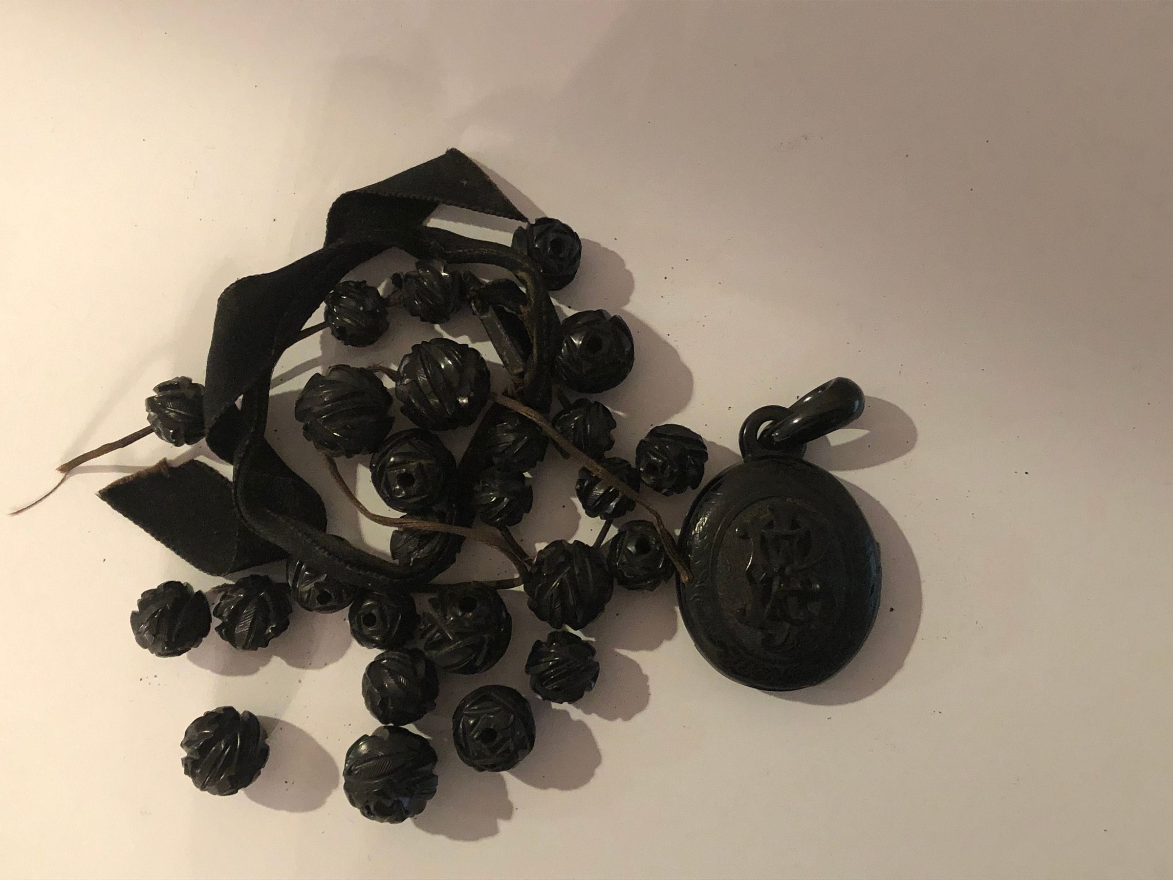 Jet mourning necklace with locket belonging to Sarah Caparn Bishop. The necklace contains a photograph of her husband John Foster Bishop, who died on October 14, 1874. Sarah Horner Caparn (1832-c.1899) was the older sister of landscape architect Thomas John Caparn. The exterior of the locket features John Foster Bishops monogram carved in high relief. The jet mourning necklace is broken.Acquisition