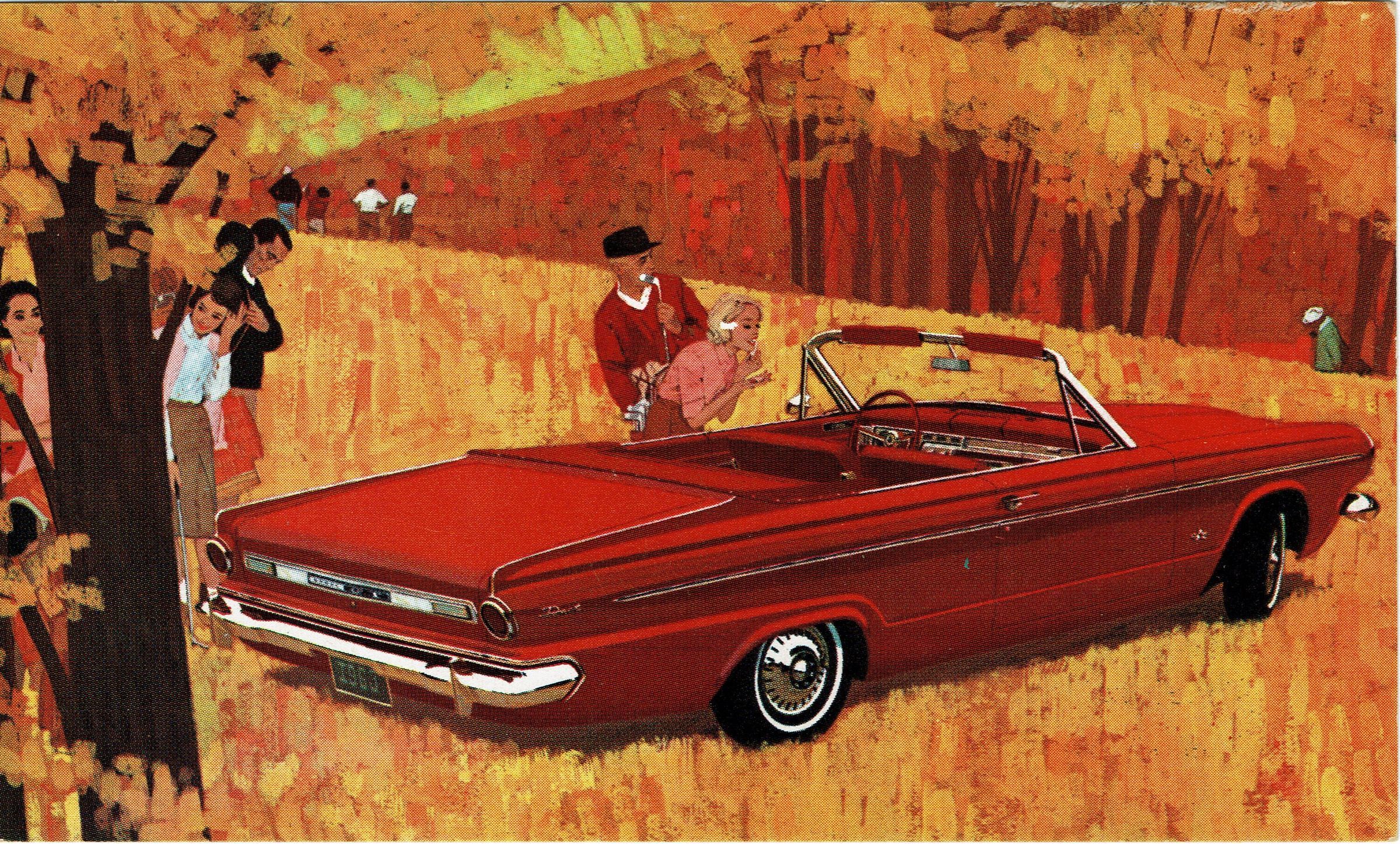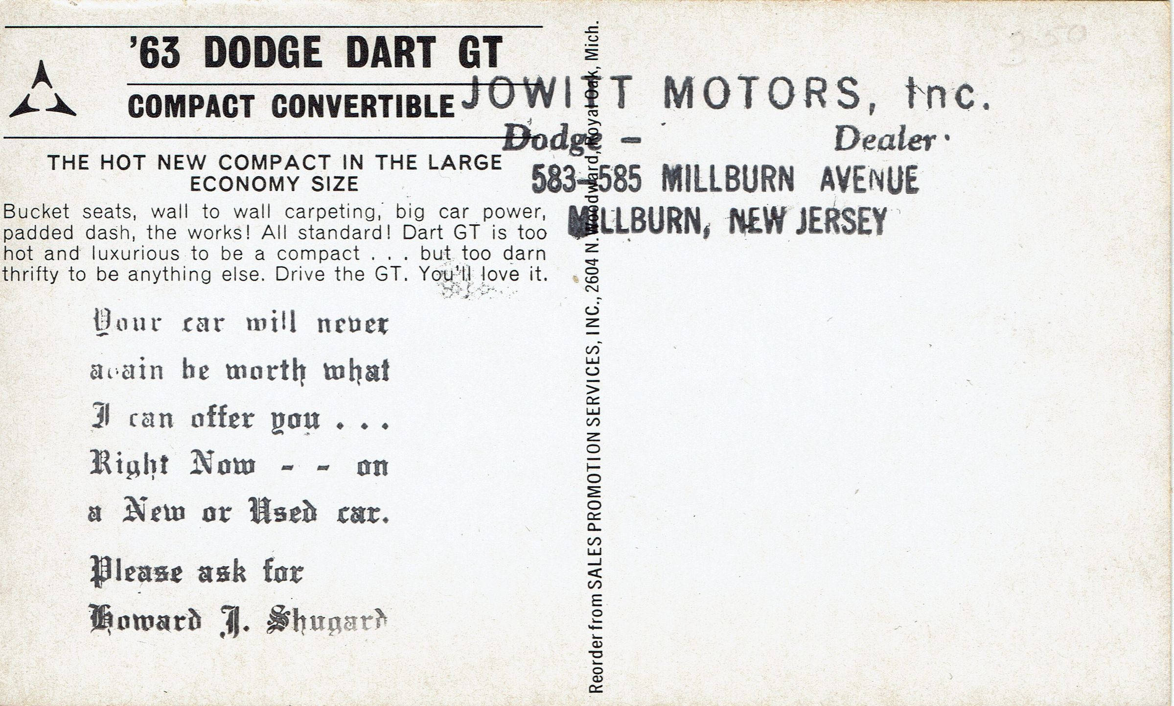 1963 Dodge Dart GT Compact Convertible color advertising postcard, postally unused, from Jowitt Motors, Inc. of 583-585 Millburn Avenue. Front of card advertises the '63 Dodge Dart GT Compact Convertible. Description on verso of card reads"The hot new compact in the large economy size. Bucket seats, wall to wall carpeting, big car power, padded dash, the works! All standard! Dart GT is too hot and luxurious to be a compact...but too darn thrifty to be anything else. Drive the GT. You'll love it."