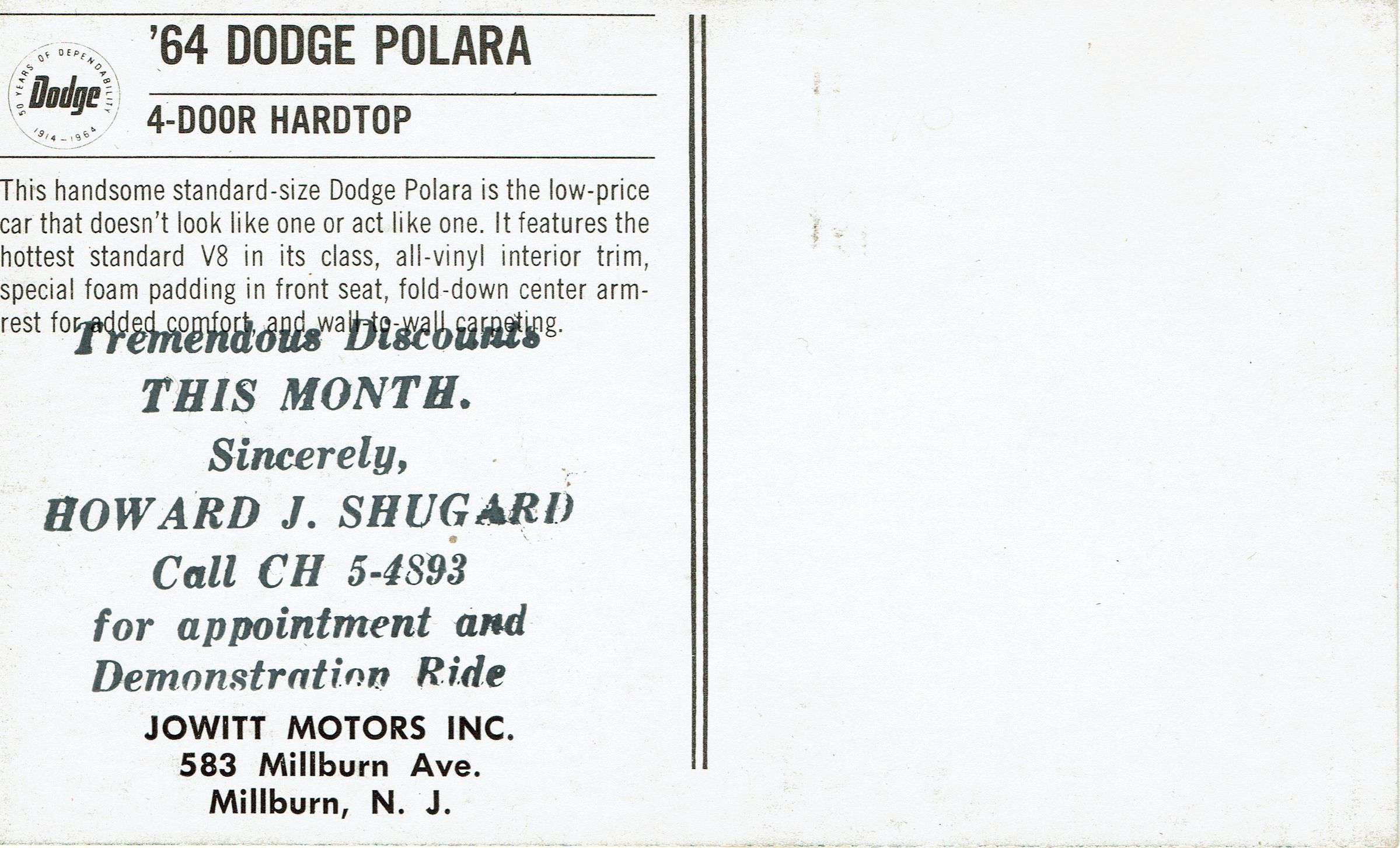 1964 Dodge Polara color advertising postcard, postally unused, from Jowitt Motors, Inc. of 583 Millburn Avenue. Front of card advertises the '64 Dodge Polara, 4-Door Hardtop. Description on verso of card reads: "This handsome standard-size Dodge Polara is the low-price car that doesn't look like one or act like one. It features the hottest standard V8 in its class, all-vinyl interior trim, special foam padding in front seat, fold-down center armrest for added comfort and wall-to-wall carpeting."