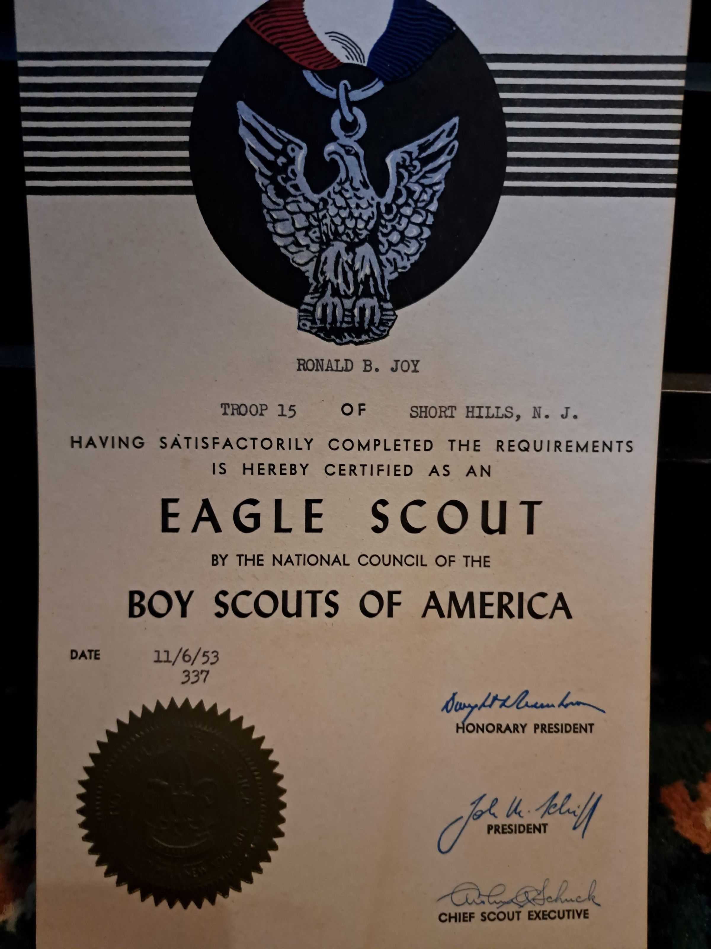 Official certificate from the Boy Scouts of America to Ronald Joy of troop 15 after he achieved the rank of Eagle Scout.Acquisition