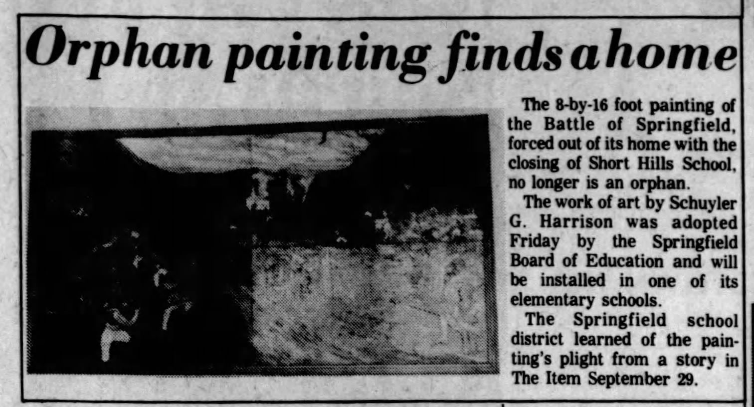 Photograph of the Battle of Springfield painting that was part of a diorama at the Recreation Building in Taylor Park for Millburn's American Bicentennial Celebrations in 1976. Photograph was taken by Owen Lampe. In 1983, the painting was donated to the Caldwell School on Caldwell Place in Springfield.Photograph Details