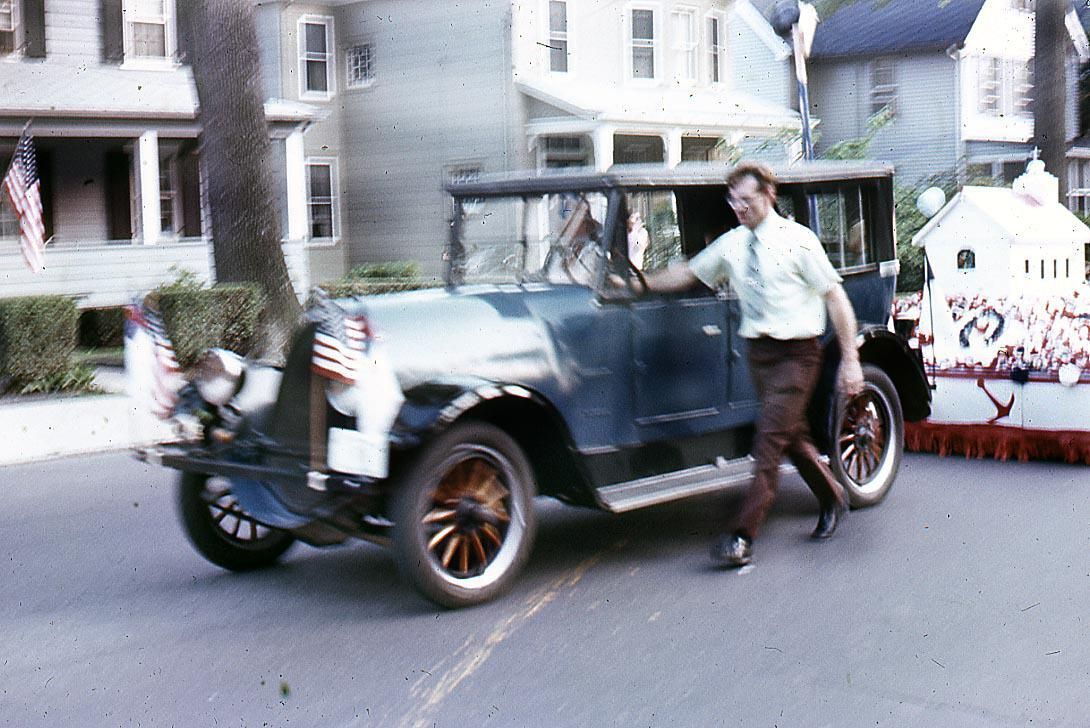 July 4: Man pushing antique car in American Bicentennial Parade, 1976Entry/Object ID