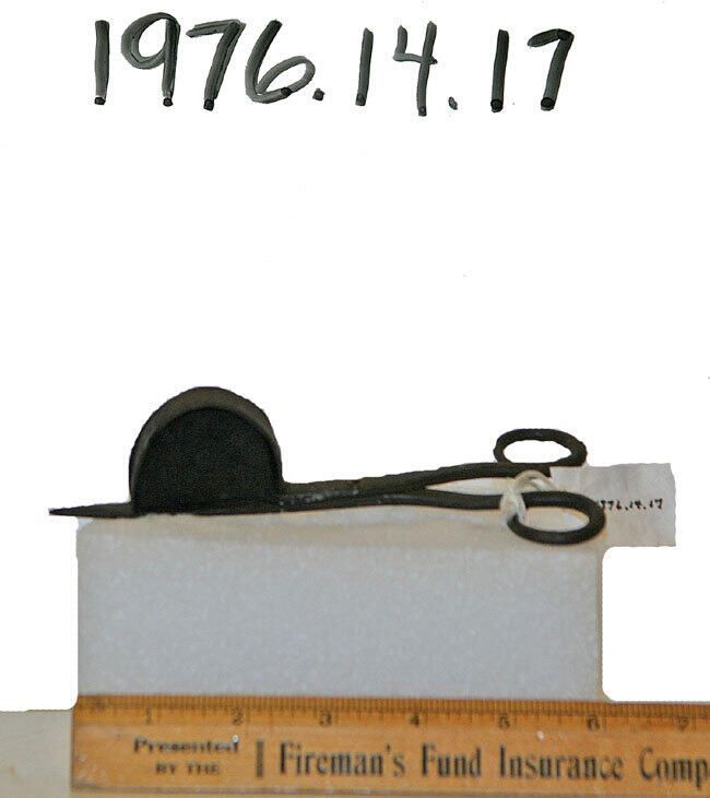 Iron Wick Trimmer and snuffer from Williamsburg Room, Millburn Library. Provenance unknown (possibly M/M Harvey Kahn). Daily life tool that combined the function of snuffing out a flame and pulling up the wick to be trimmed for future use.