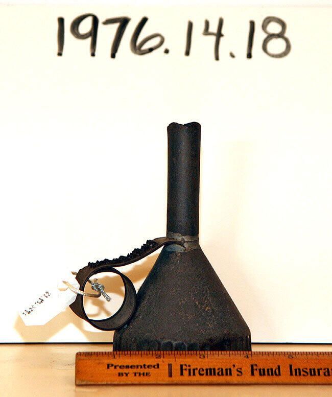 Metal funnel/grater from Williamsburg Room, Millburn Library. Provenance unknown (possibly M/M Harvey Kahn). Metal (tin?) multi-purpose kitchen tool -- funnel, grater, cookie cutter, scraper. The mouth of the funnel is crimped, probably for cutting biscuits or cookies. The funnel end has a gently scalloped mouth, probably also for cutting small shapes. The handle has rows of holes with metal points, for grating. The handle also has jagged teeth on one edge, probably for scraping. Entire surface is worn and slightly rough. The inside of the funnel retains some of the silvery plating.Collection