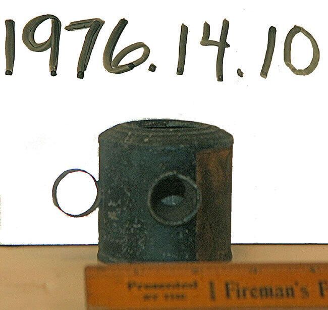 Black Egg Candler/Tester from Williamsburg Room, Millburn Library. Provenance unknown (possibly M/M Harvey Kahn). Condition: Black painted, handled, egg cancler with circa 1.5" X 1.5" broken mirror piece inside. Viewing hole on side. Very stained paper label says, "The Family Egg-Tester" with picture of woman looking through viewer to egg sitting on top of tester. Paper label also reads, "Manufactured only by Krepps and Co., 38 Bey St., N.Y.; 719 Sansom St., Phila." Instructions on label are, "If the egg is good, it within a manner be transparent (according to the thickness and color of the shell), If rotten or tainted, it will present a black or dark dull, blue color."Collection