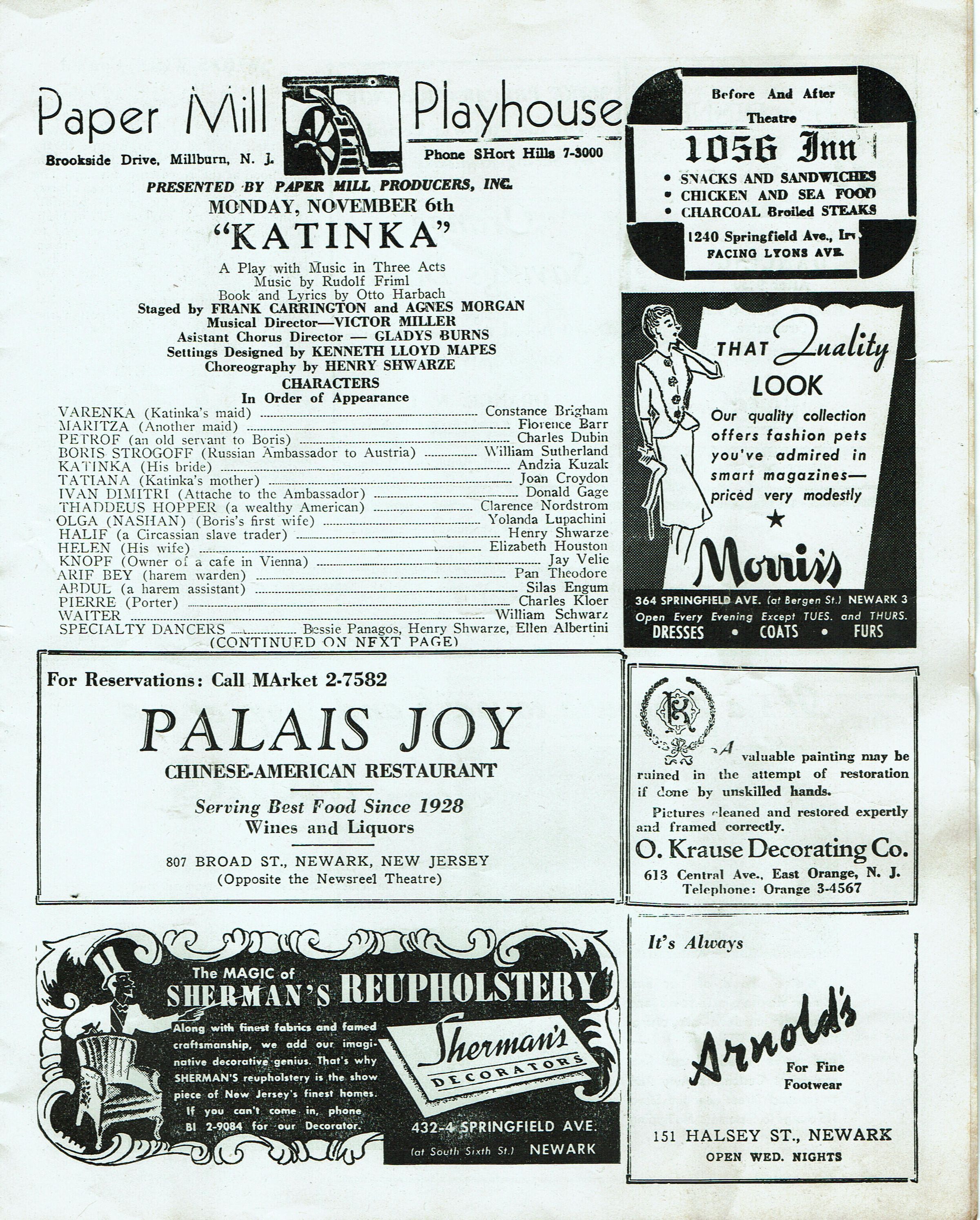 Paper Mill Playhouse Program for Katinka, week beginning November 6, 1944 with Donald Gage, Andzia Kuzak and Clarence Nordstrom. 12 pages, illustrated with B&W advertisements to local businesses.