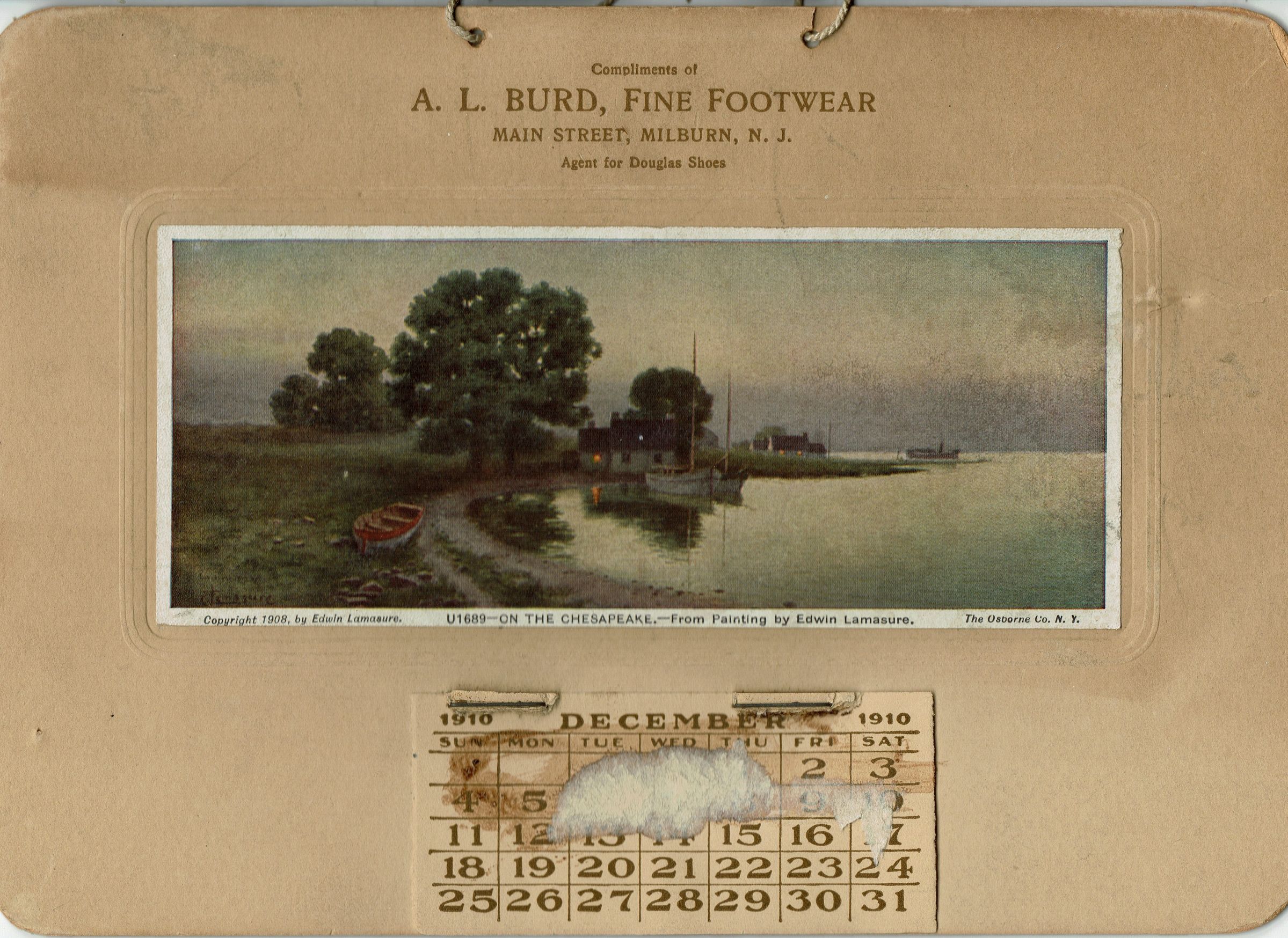 Complementary calendar for the year 1910 given by A.L. Burd, Fine Footwear, Main Street, Millburn, N.J. Agent for Douglas Shoes. Calendar pages have been torn off with only December 1910 remaining.Collection