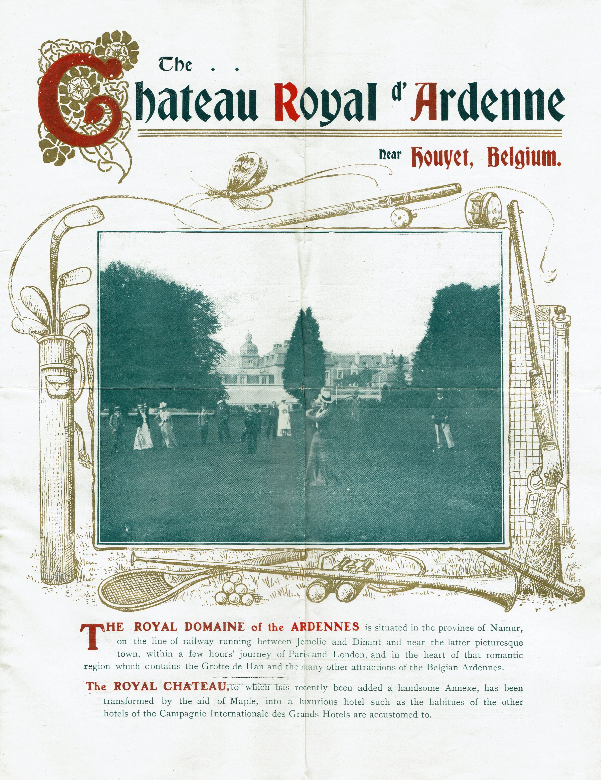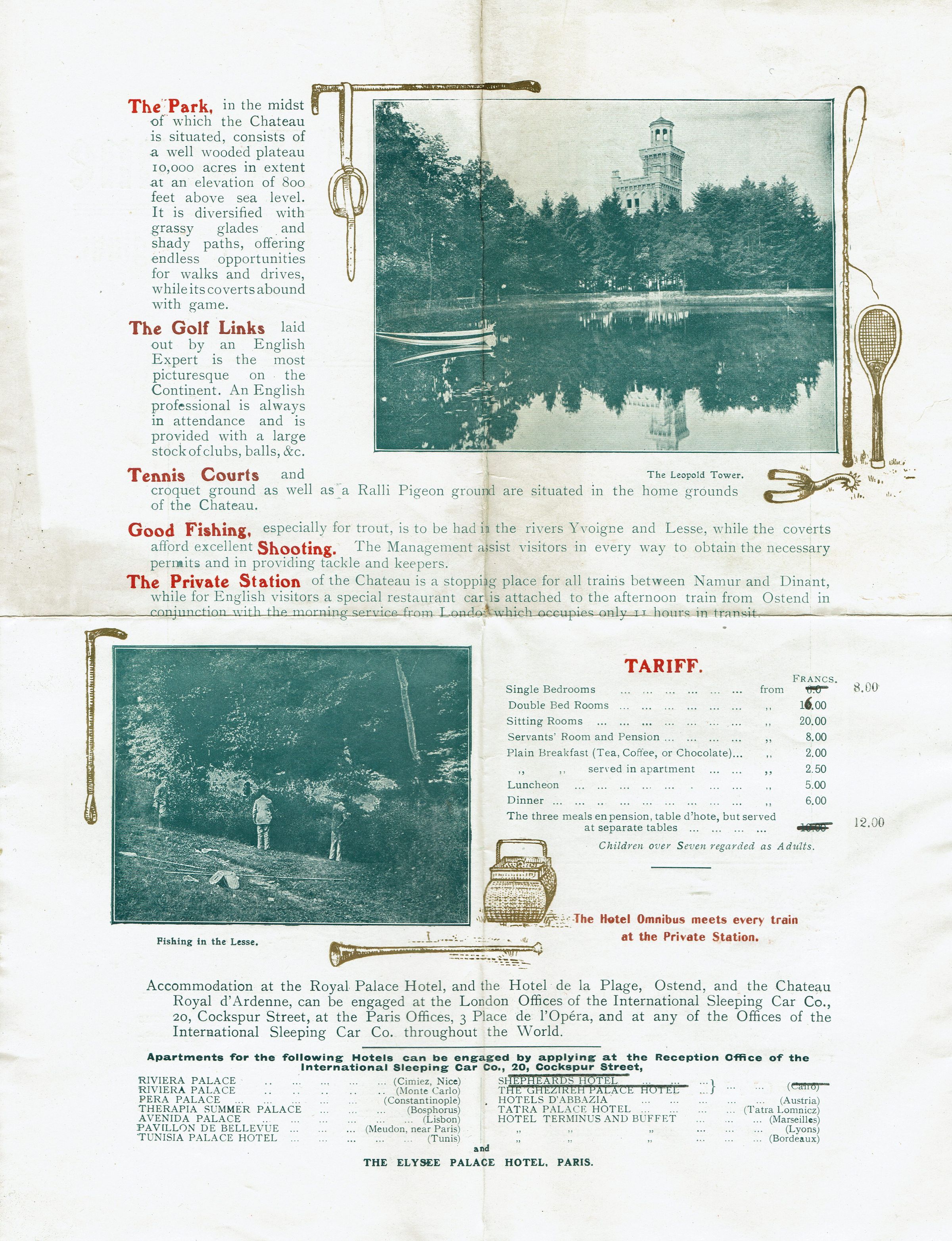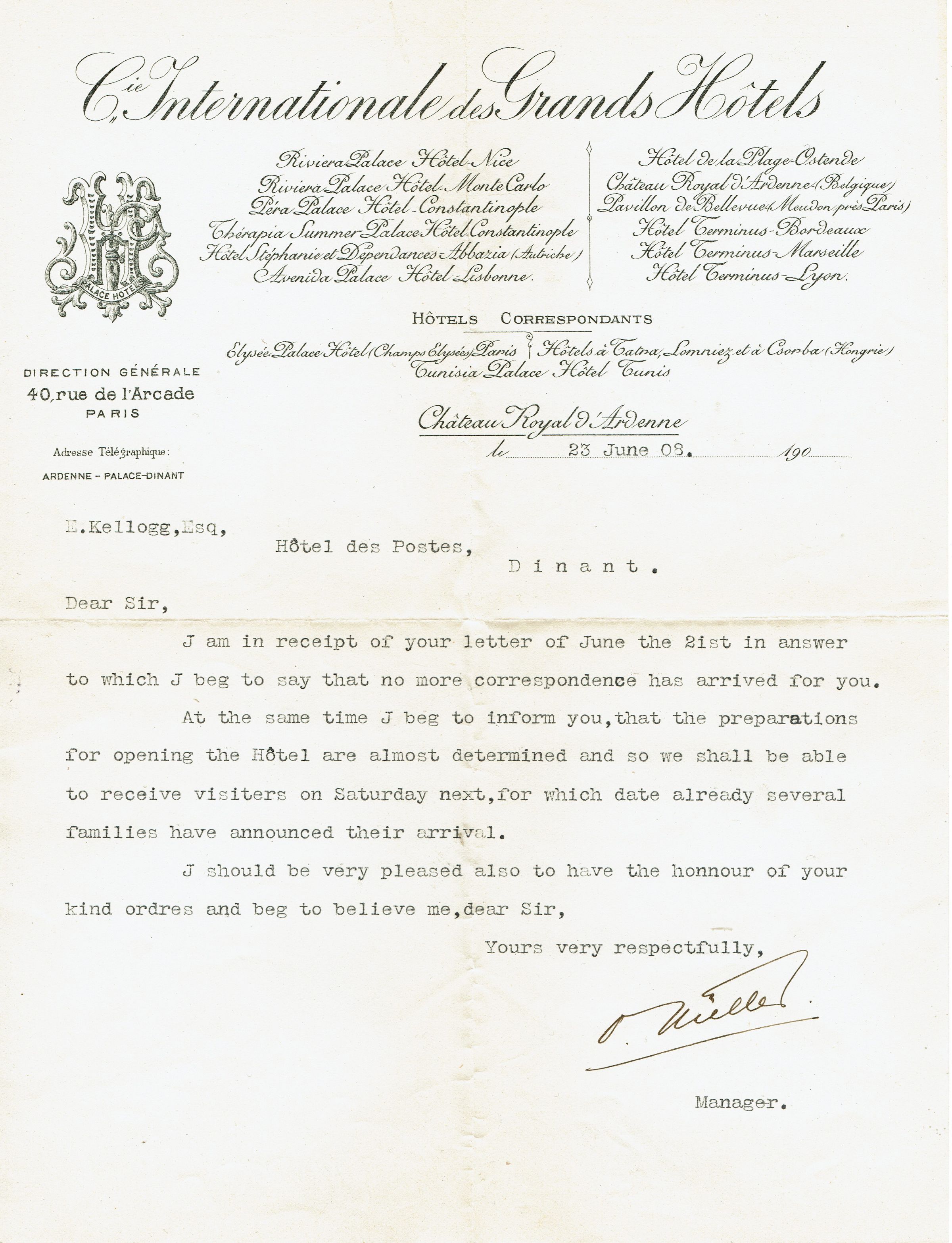 Promotional Materials and letter of confirmation from the luxury hotel the Chateau Royal D'Adrenne, Houyet Belgium. The letter is addressed to Edward Kellogg and dated 23 June 1908. The manager notes that no correspondence had arrived for Mr. Kellogg and that the hotel will be open for visitors a week from Saturday. The 2 page promotional flyer is illustrated with B&W photographs and decorative details.Collection