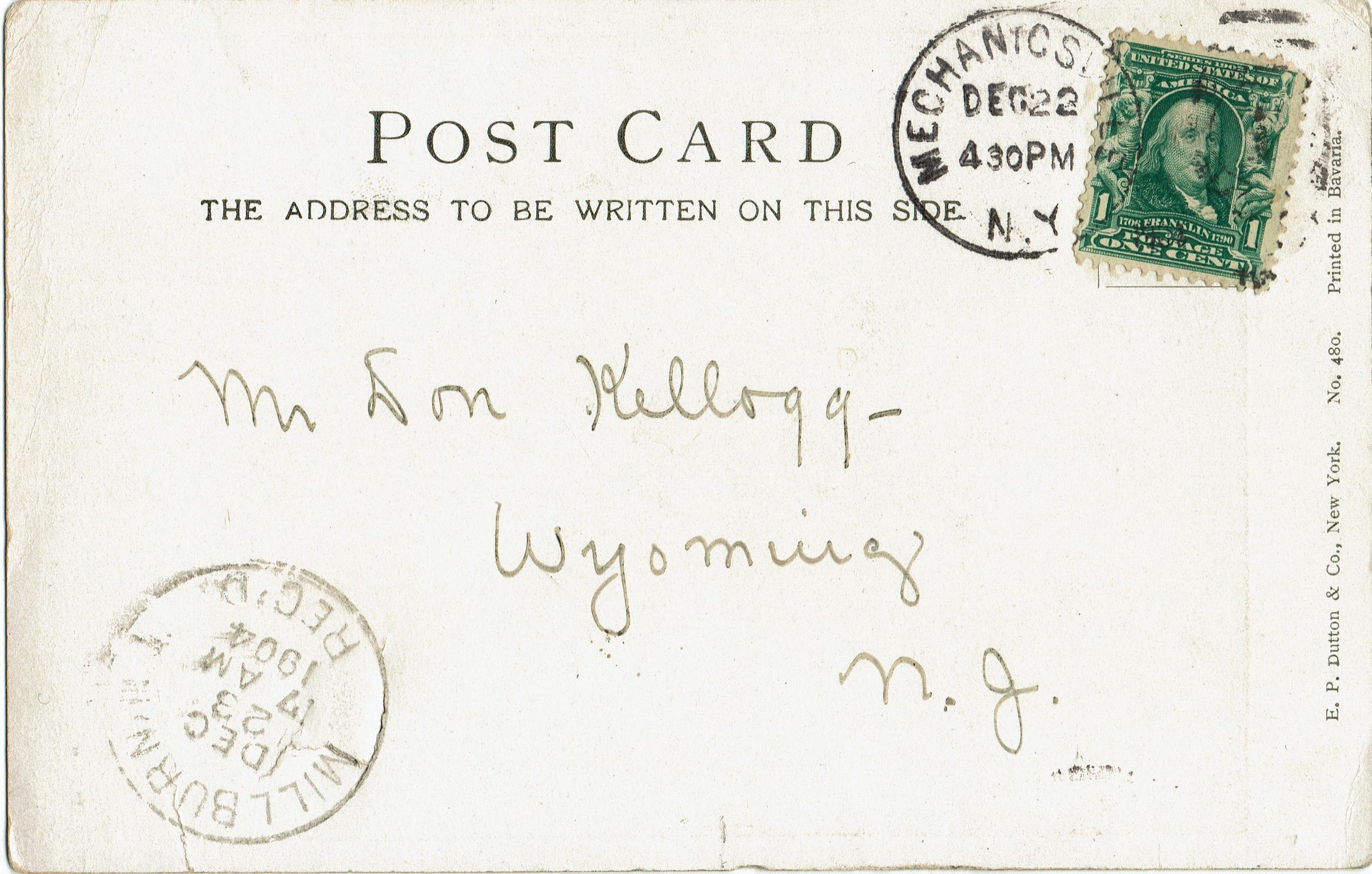 Postcard addressed to Mr. Don Kellogg, Wyoming, NJ and postmarked December 23, 1904. Handwritten message "Merry Christmas and Happy New Year." Postcard was published by E.P. Dutton & Co., New York, #480, printed in Bavaria.Collection