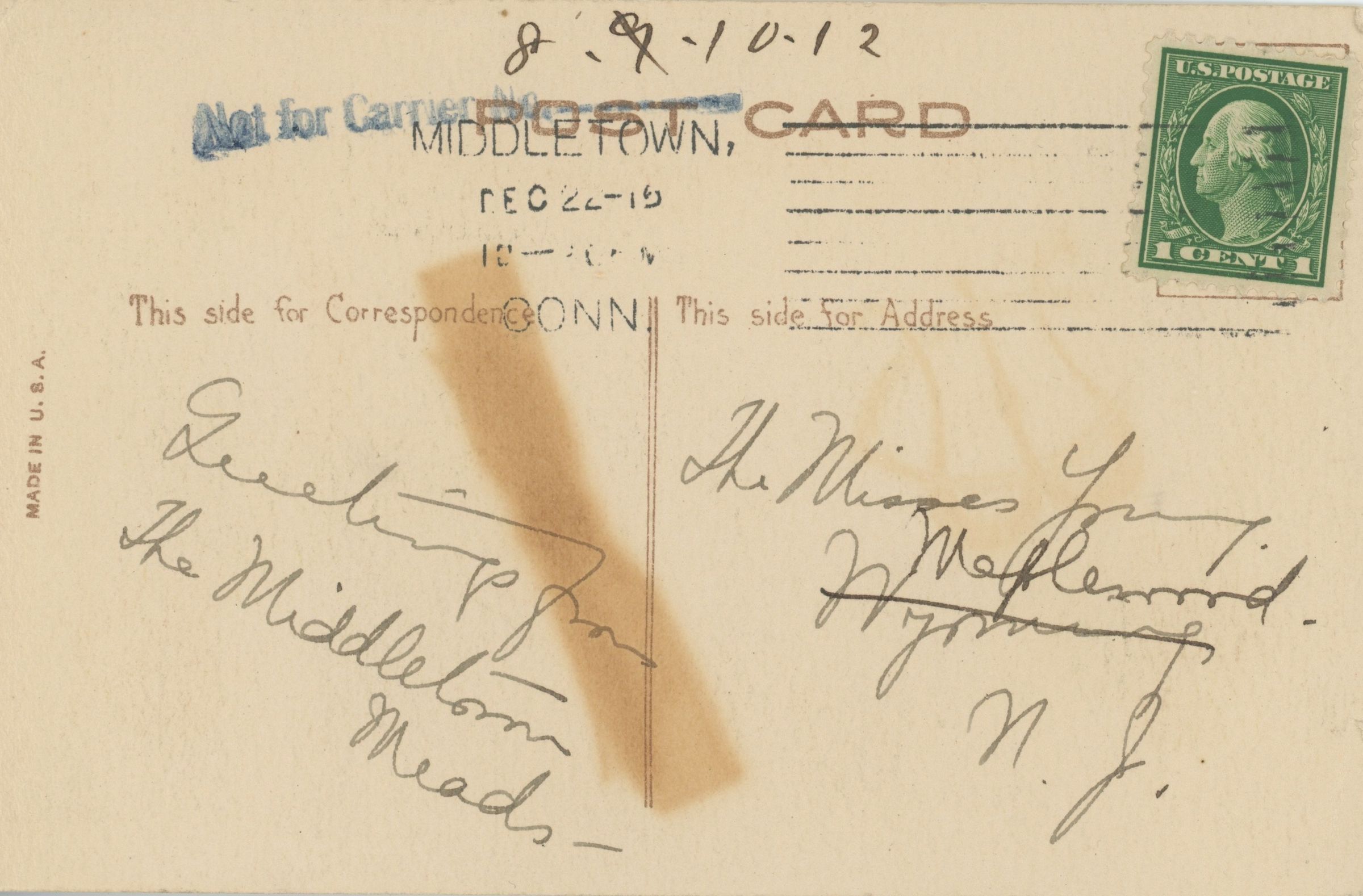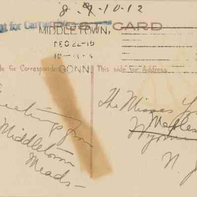 Postally used postcard from "The Middletown Meads" to The Misses Young, Maplewood, N.J postmarked Middletown, December 22, 1915. The senders crossed off Wyoming in the address and wrote Maplewood, probably because mail for the Wyoming section of Millburn was delivered to the Maplewood post office at that time.