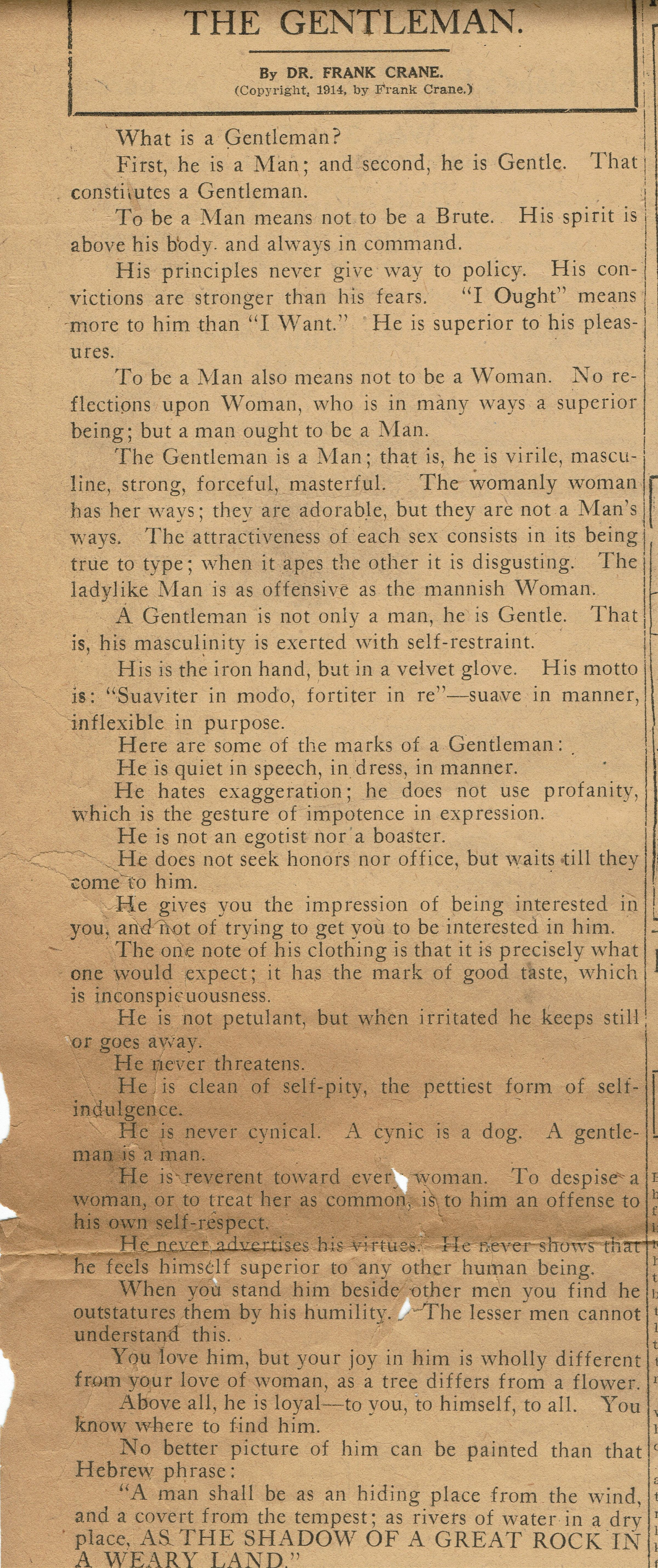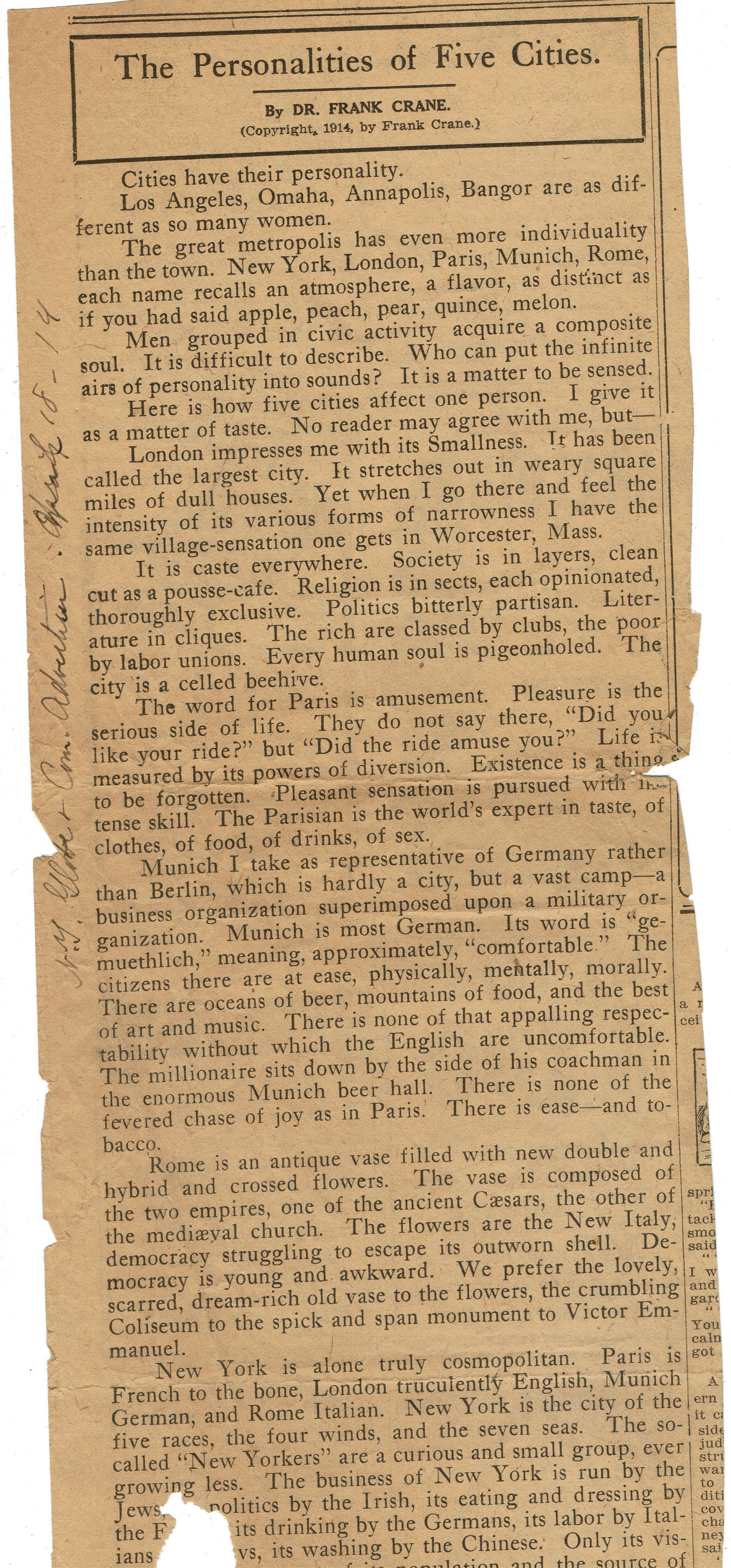 Clippings from the New York Globe and Commercial Advertiser, 1914 of Dr. Frank Crane's articles "The Personalities of Five Cities" and "The Gentleman." Dr. Frank Crane (1861–1928) was a Presbyterian minister, speaker, and columnist who wrote on moral issues and offered advice. He is best known for his "Four Minute Essays" which were published in 1919.Collection