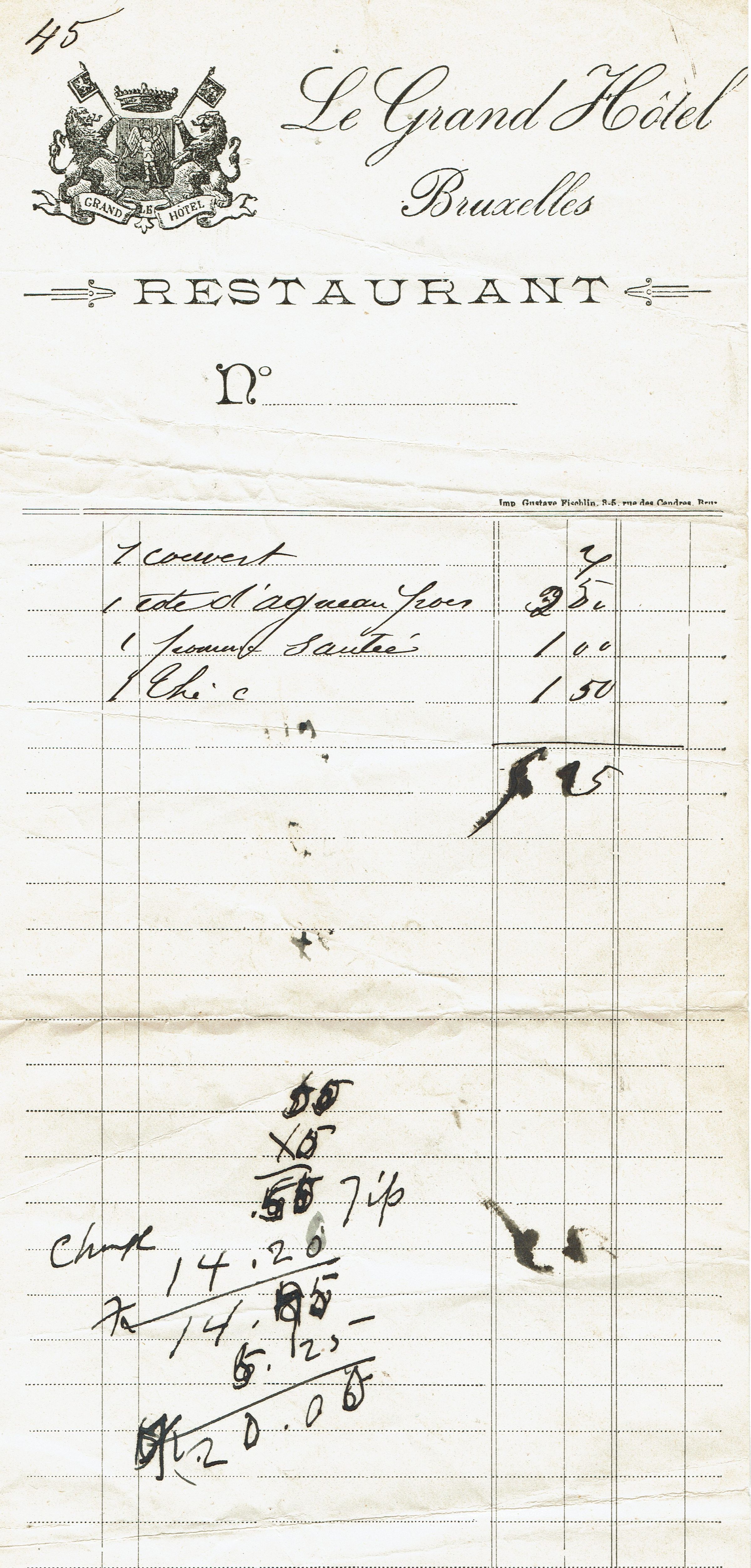 Undated receipt from Le Grand Hotel Bruxelles, Restaurant.Collection