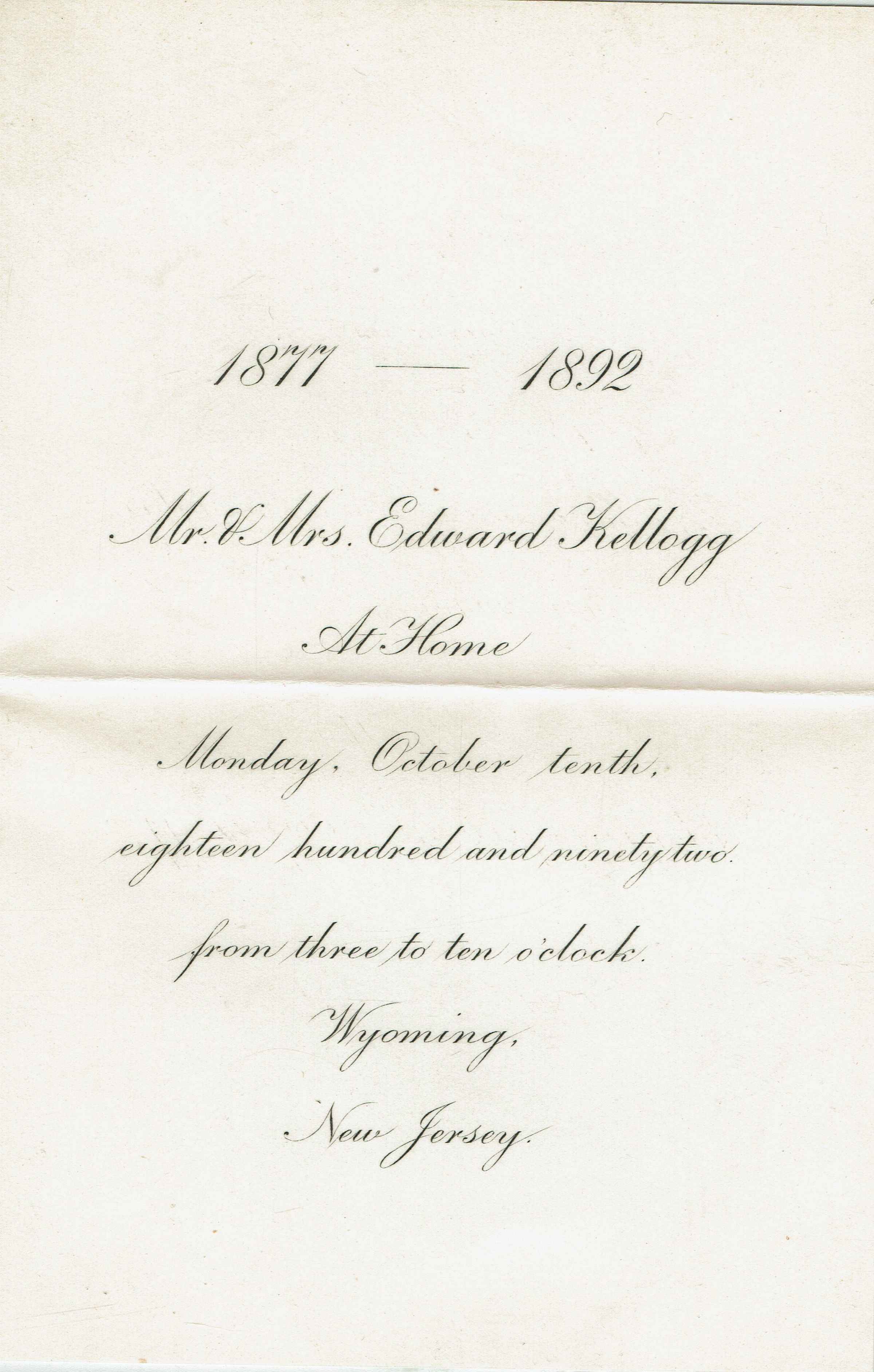 Engraved invitation and engraving plate for Mr. and Mrs. Edward Kellogg's 15th Wedding Anniversary celebration at their home, 471 Wyoming Avenue, on Monday, October 10, 1892.Collection