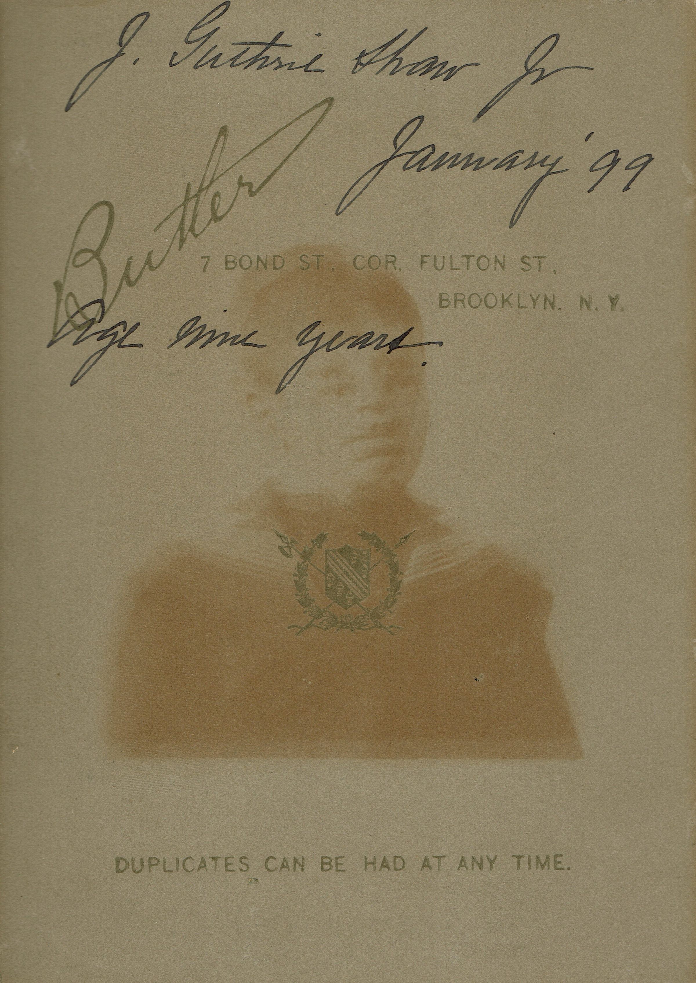 Inscription on Back reads: J. Guthrie Shaw Jr, January '99. Age nine years. Photographed at Butler studios, 7 Bond Street, Corner of Fulton Street, Brooklyn NY.Collection