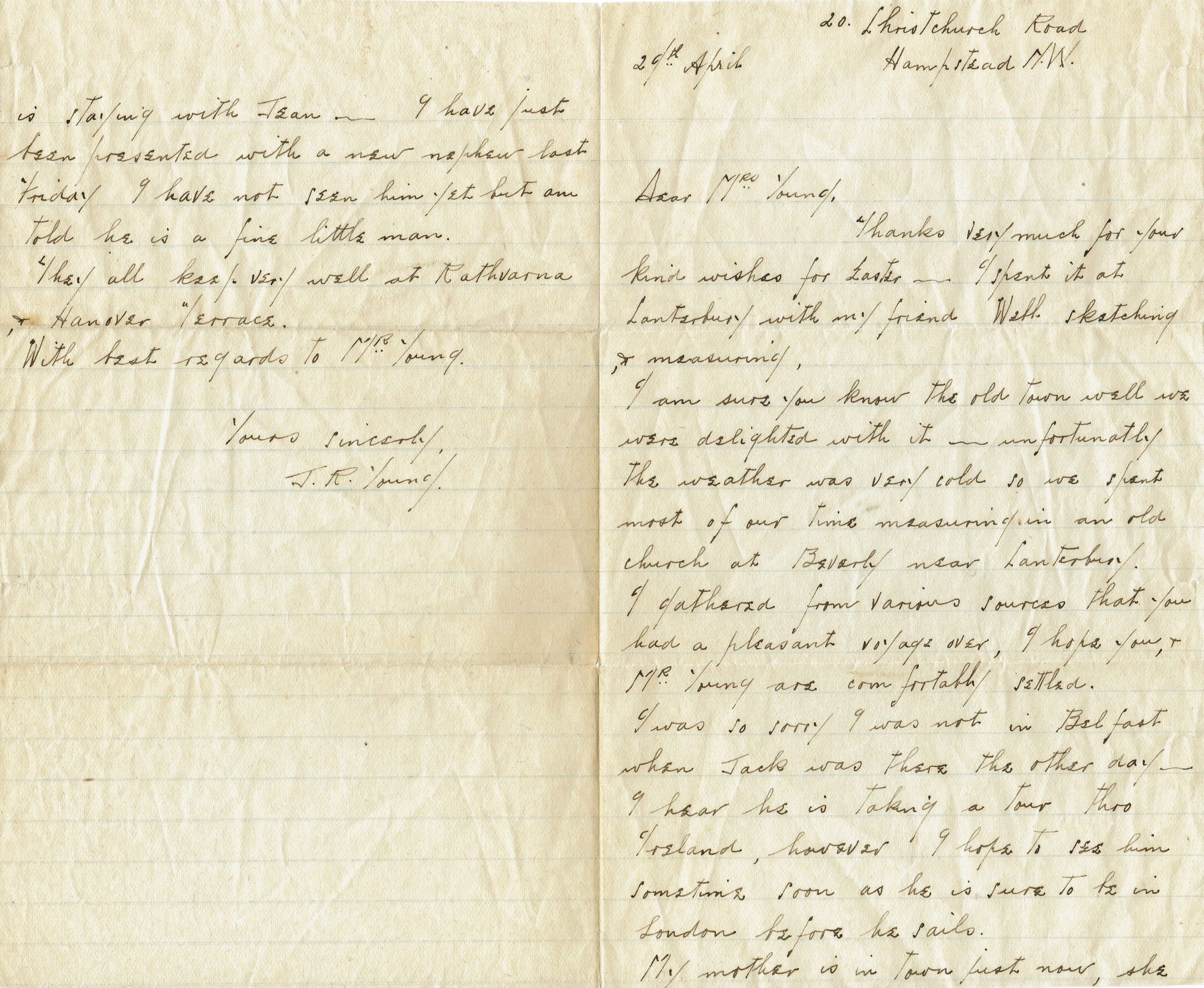 Two-page letter from J.R. Young, 20 Christchurch Road, Hampstead, N.W. to Mrs. Young dated 29 April. Refers to Jack, who was visiting Belfast the other day. Year of letter is unknown.Collection