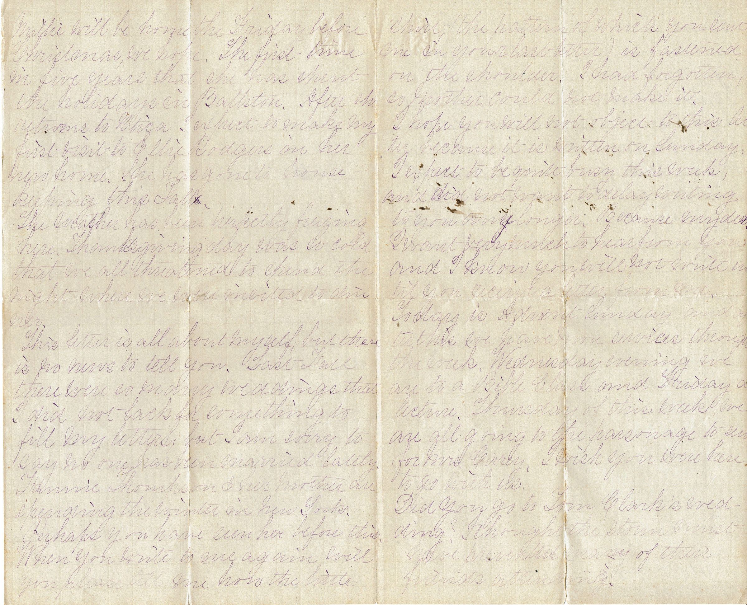 Four-page letter from Laurie Sargent to Bessie Kellogg dated December 3, 1871. Part of collection of letters from the early 1870s to Bessie Kellogg.Collection