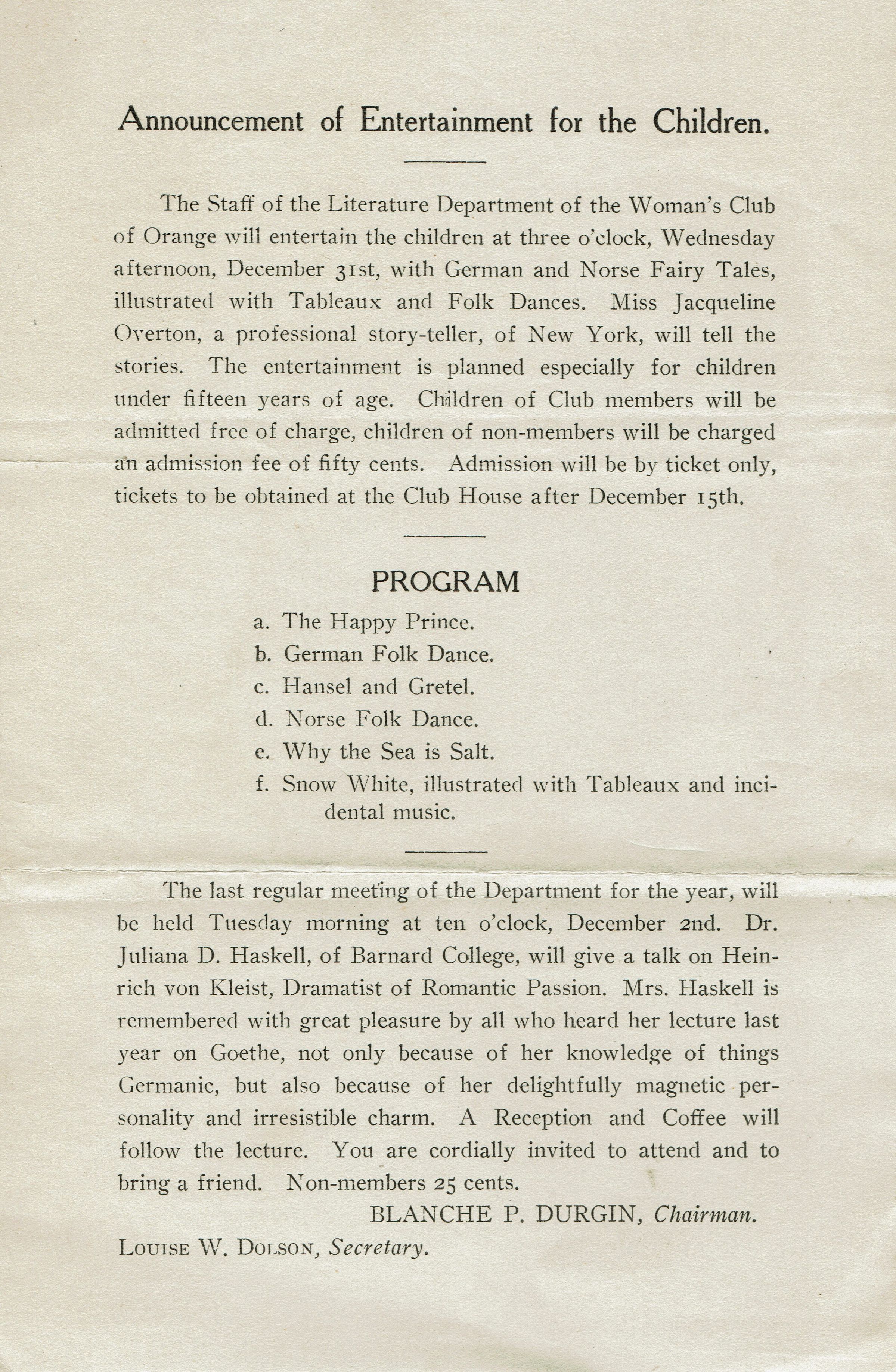 New Jersey State Federation of Women's Clubs one page document c. 1909-1911. Women's Club of Orange December Program (Year unknown).Collection