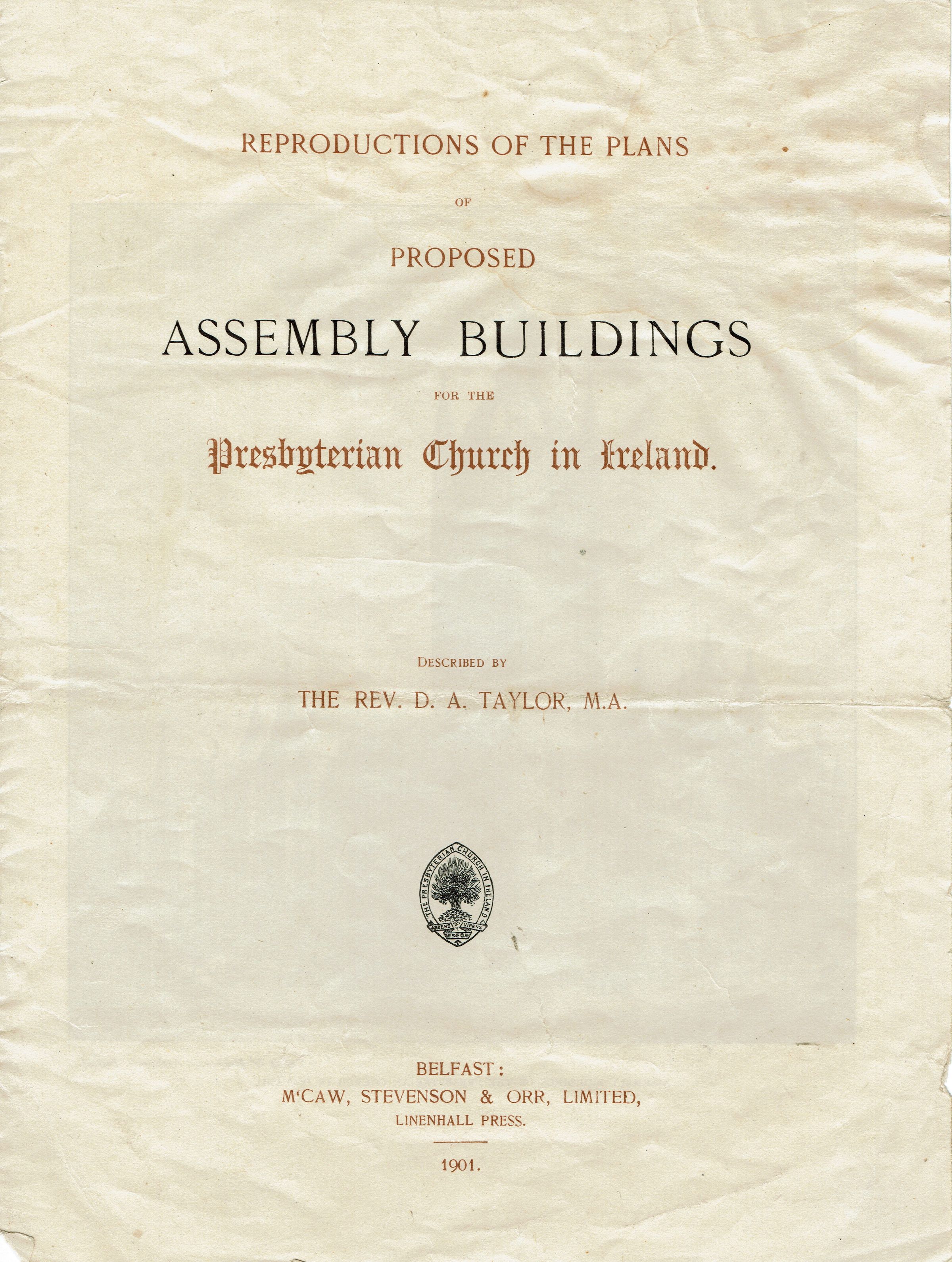 Reproduction of a print of the Presbyterian Church in Belfast, Ireland from Reproductions of the Plans of Proposed Assembly Buildings for the Presbyterian Church in Ireland Described by the Rev. S.A.Taylor. Belfast: McCaw, Stevenson & Orr, Limited, 1901.Collection