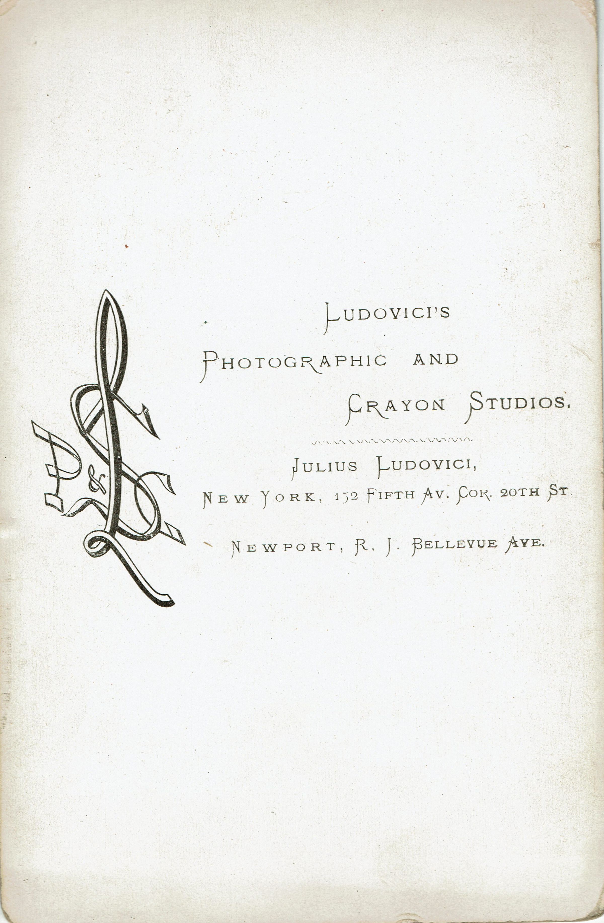 Verso of card reads: "Ludovici's Photographic and Crayon Studios. Julius Ludovici, New York, 152 Fifth Avenue, Corner 20th Street; Newport, R.I. Bellevue Ave.Photograph Details