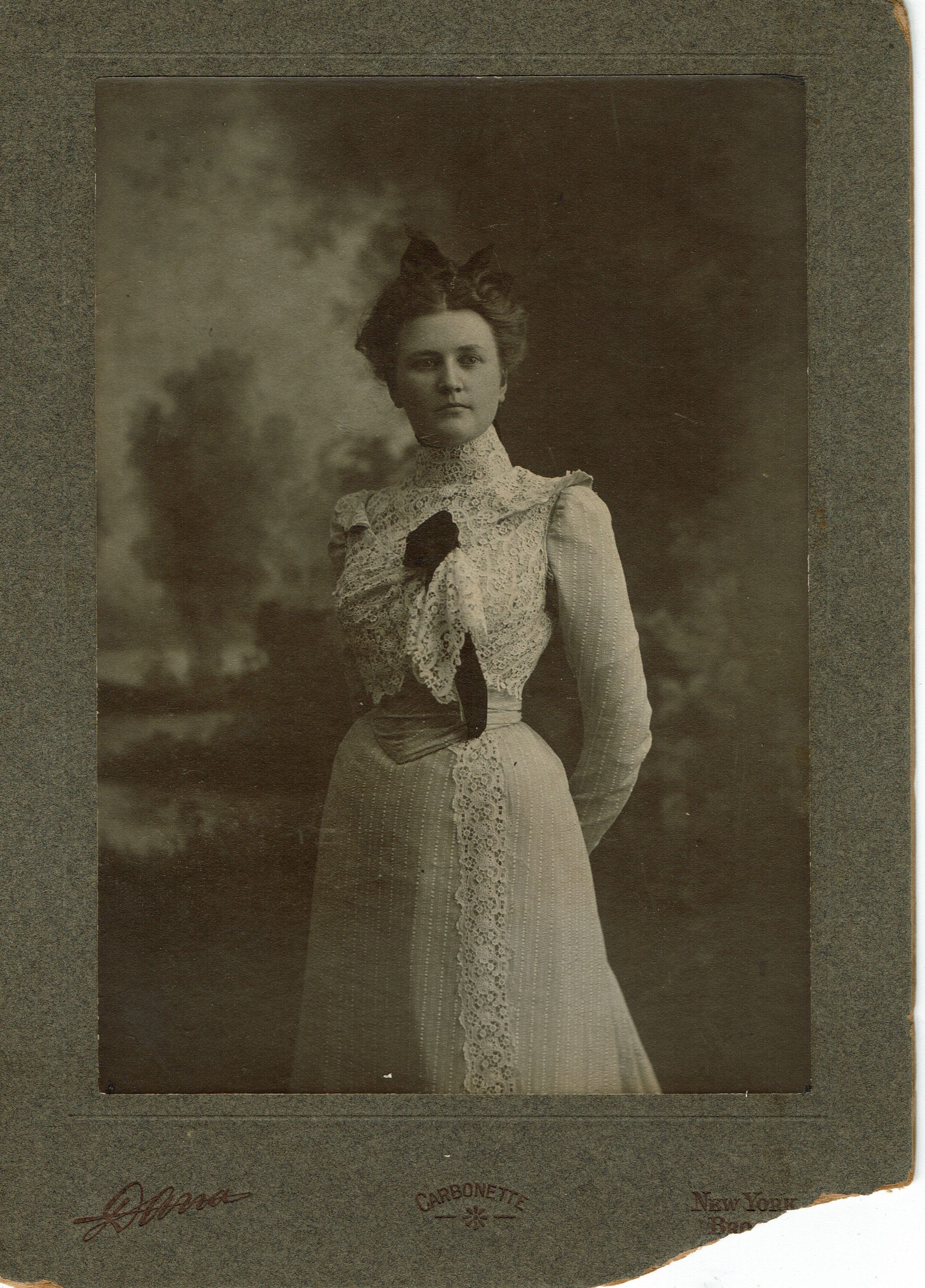 Photograph of an unidentified female wearing an intricate lace dress, standing against a painted landscape background. Photograph was taken at the Dana studio, New York, Brooklyn.Photograph Details