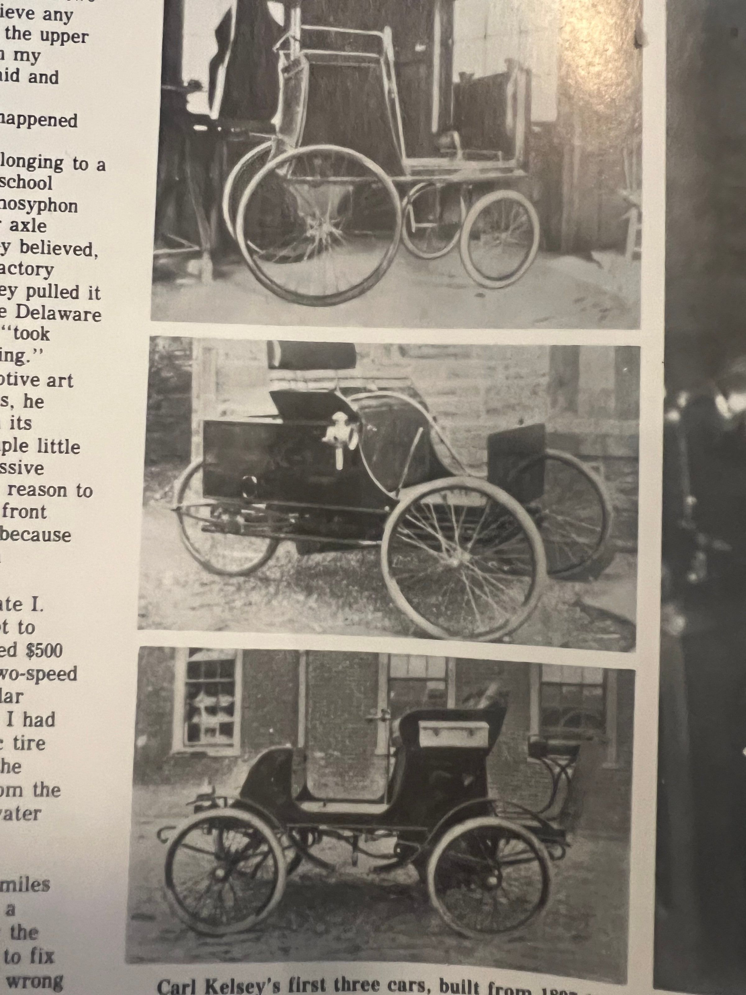 Black and white photographs of Kelsey's first three cars built from 1897-1901. The first and third cars have four wheels each. The second car has three wheels and was built in partnership with his friend Sheldon Tilney. Found in the book Automobile Quarterly.Acquisition