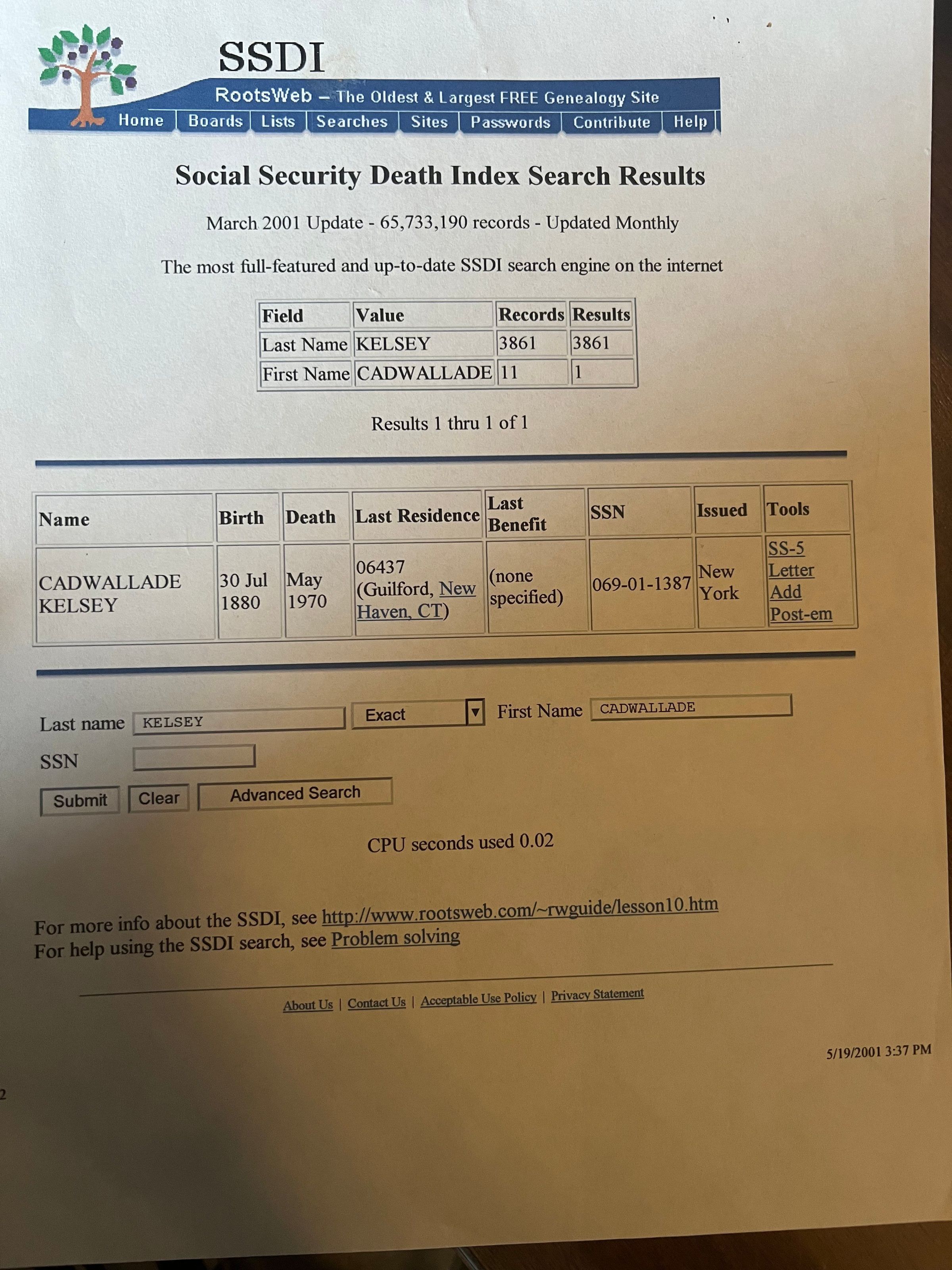 A printout of the results shown when typing C.W. Kelsey's name on the website Social Security Death Index.Acquisition