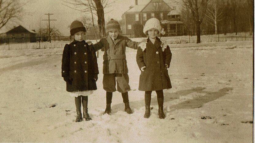 Three children standing in the snow with houses in the background. "Clark" is inscribed on verso of photograph.Acquisition