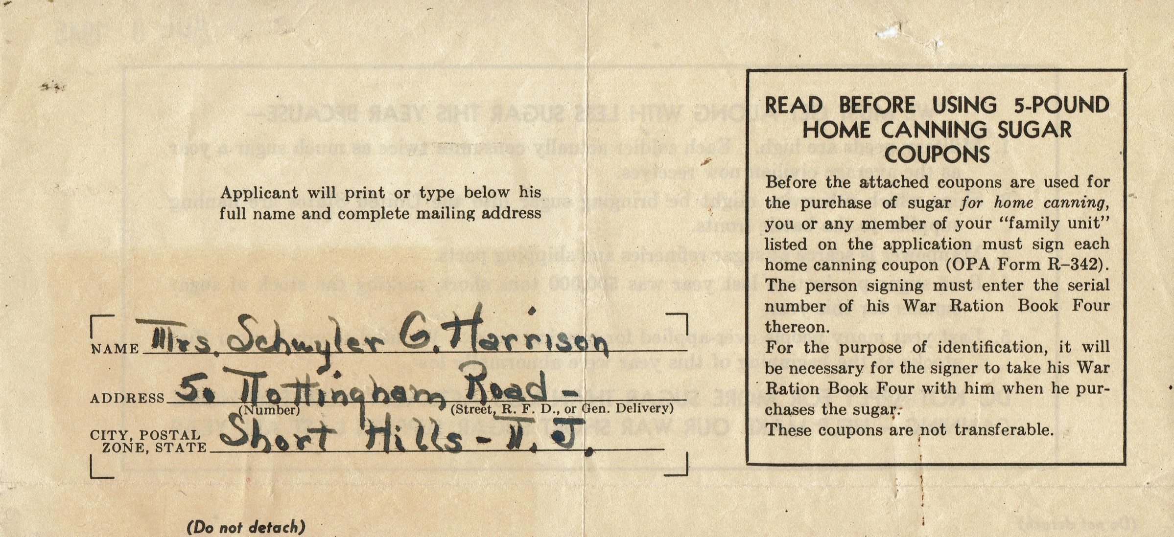 Sugar Ration Coupons issued to Mrs. Schulyer G. Harrison, 50 Nottingham Road, Short Hills, NJ on August 8, 1945. Mrs.Schuyler G. Harrison was the mother of Helen Lampe. Ration coupons were printed by the United States of American Office of Price Administration. Stamp on verso of instructional page gives date.Acquisition