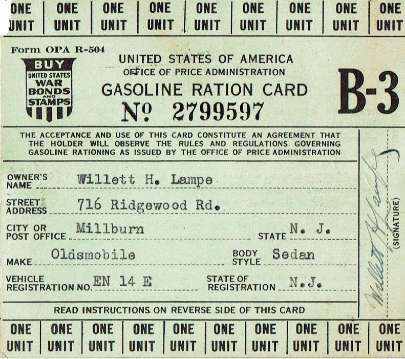 Gasoline Ration Card issued to Willett H. Lampe, 716 Ridgewood Road, Millburn in 1942.Acquisition