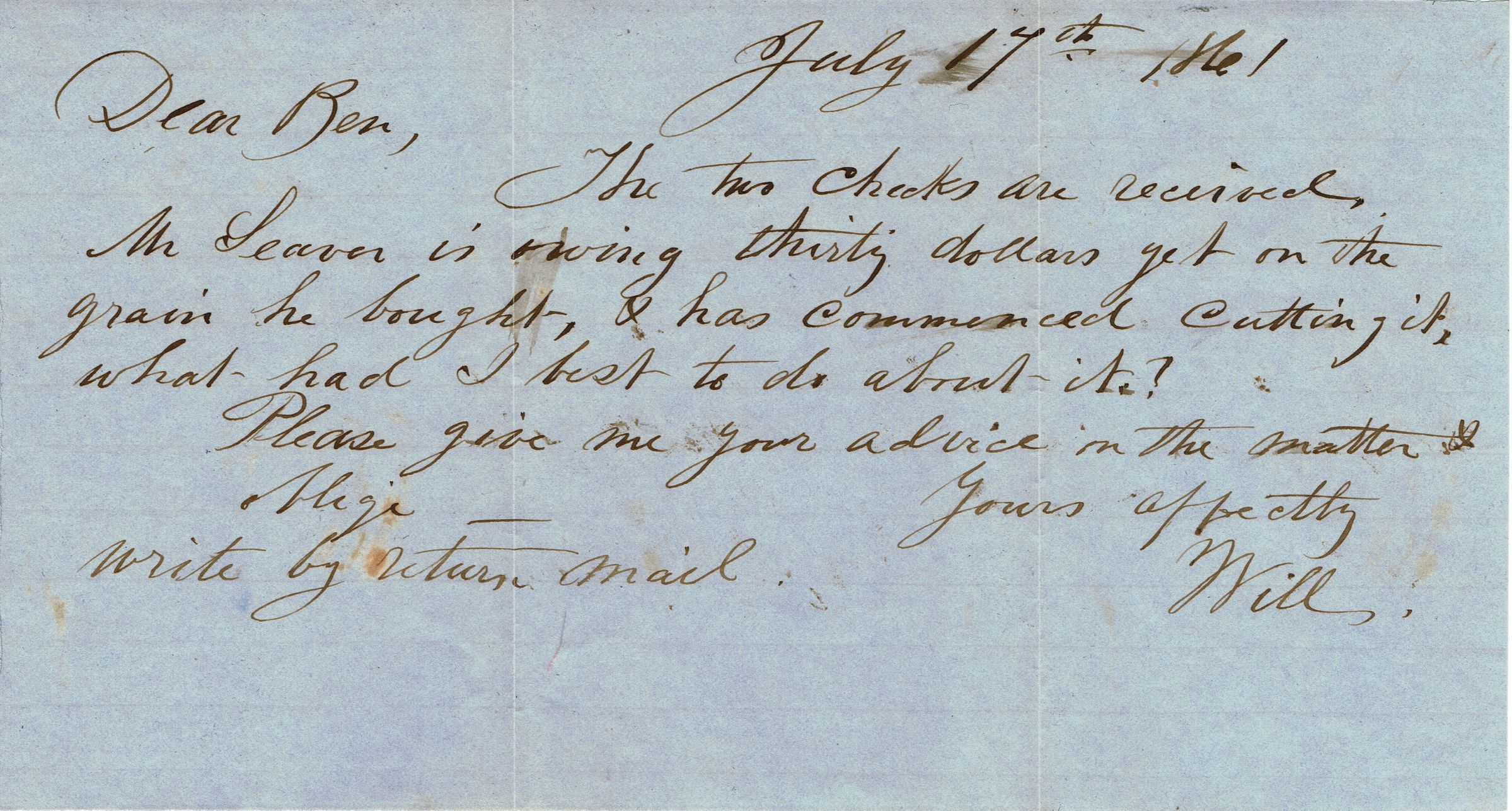 The text of the letters are as follows: "July 17, 1861. Dear Ben, The two checks are received. Mr. Seaver is owing thirty dollars yet on the grain he bough, and has commenced cutting it. What had I best to do about it? Please give me your advice on the matter. I oblige write by return mail. Yours affectly, Will."