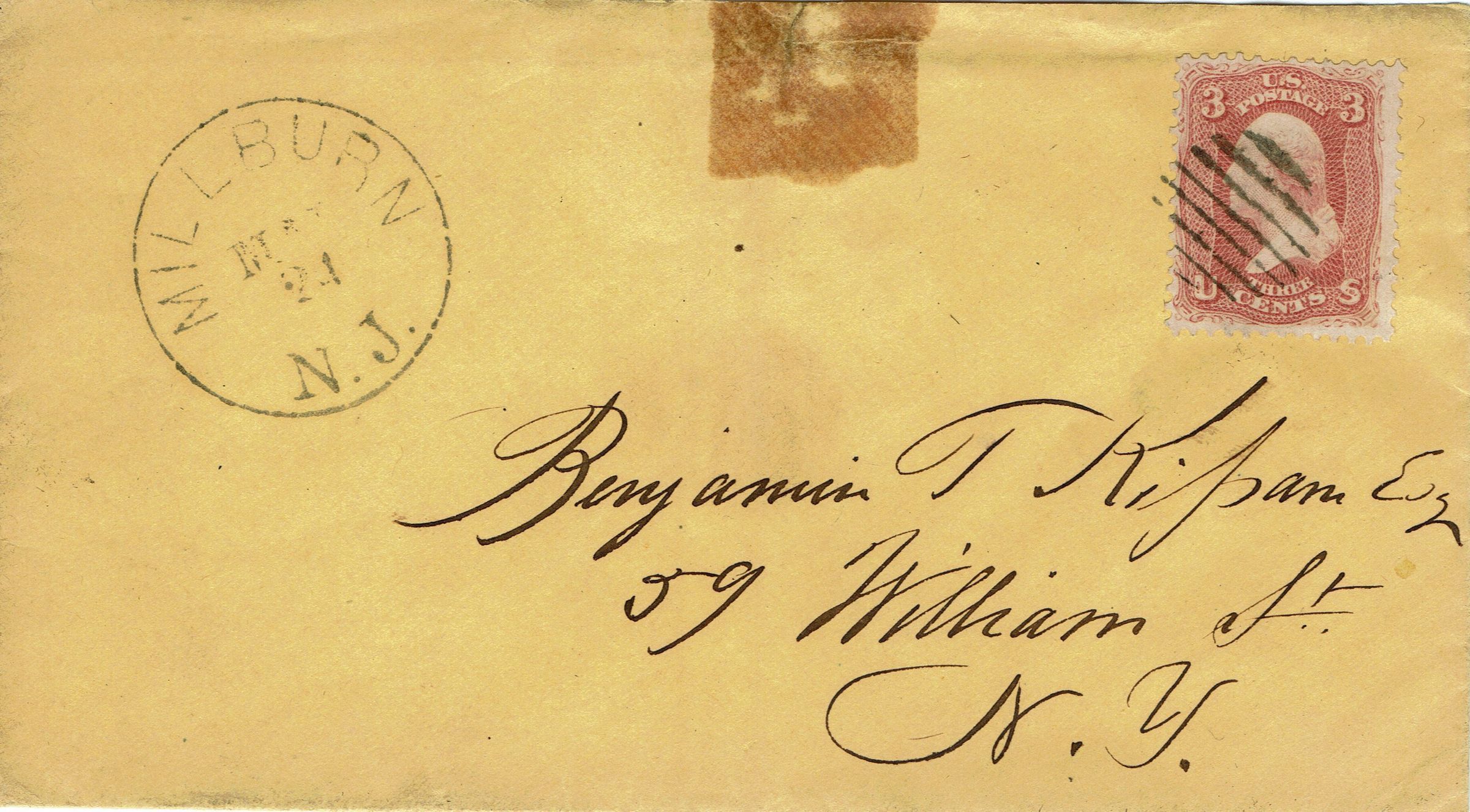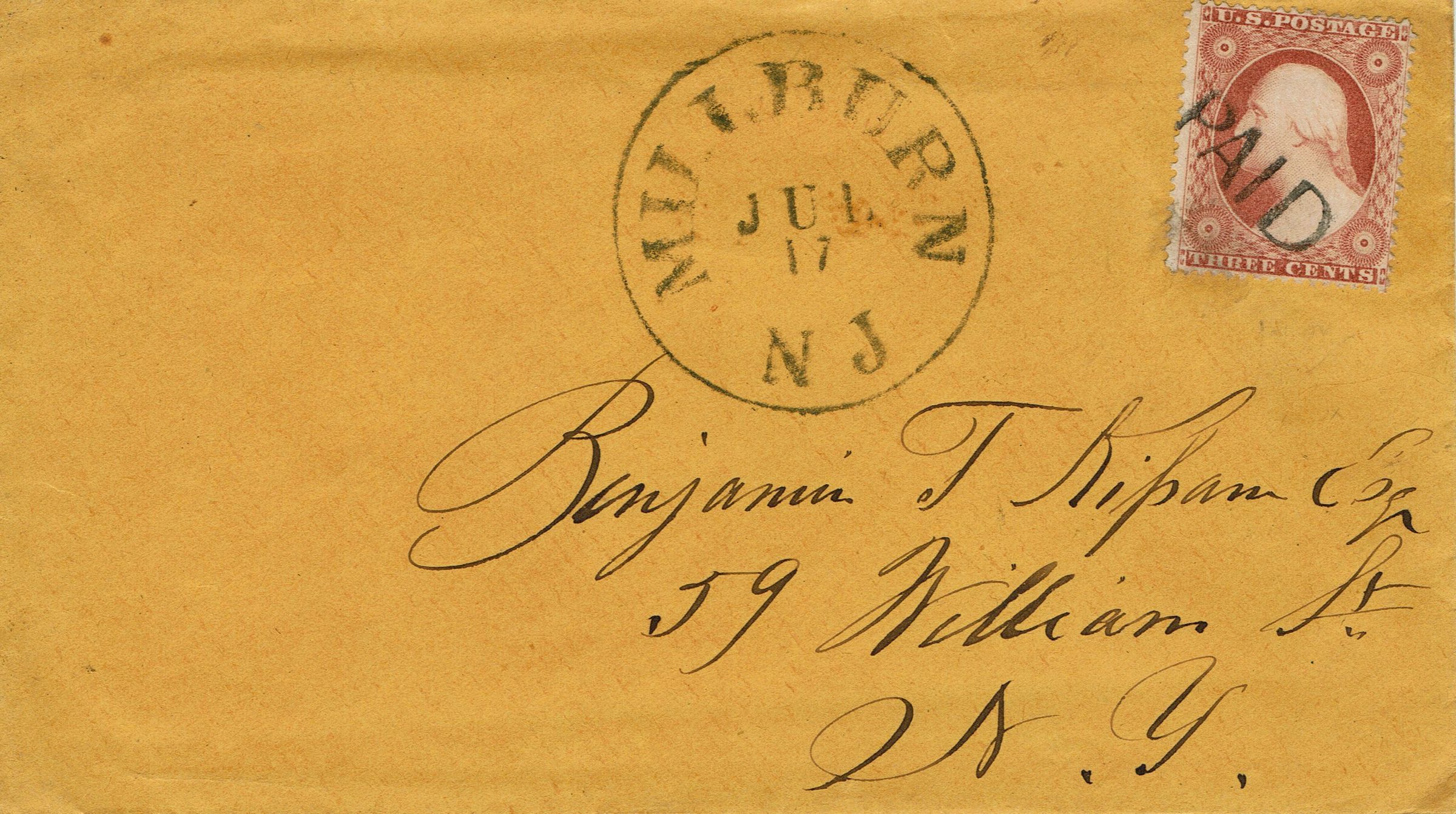 A pair of letter and envelopes from "Will" in Millburn sent to Benjamin T. Kipam, Esq., 59 William Street, New York postmarked Millburn, July 17, 1861 and Millburn, May 24, 1862. The letters relate to a Mr. Seaver, who operates a farm, but receives money from Kipam.
