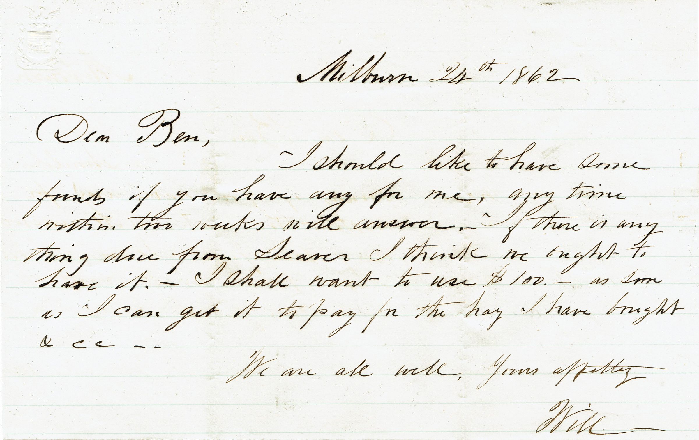 "Millburn 24th 1862. Dear Ben, I should like to have some funds if you have any for me any time within two weeks will answer. If there is anything due from Seaver I think we ought to have it. I shall want to use $100 as soon as I can get it to pay for the have I have bought on cc..(?) We are all well. Yours affectly. Will"Acquisition