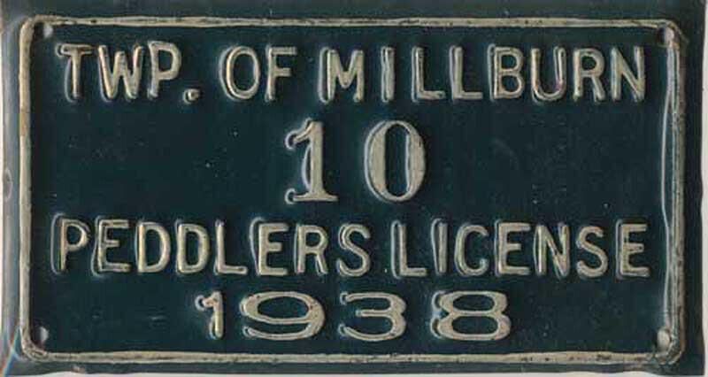 Metal 1938 Township of Millburn Peddler's License #10 Green background, white raised letters.Acquisition