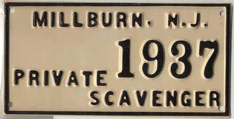 1937 Millburn, New Jersey private scavenger license, white background, black raised letters, metal.