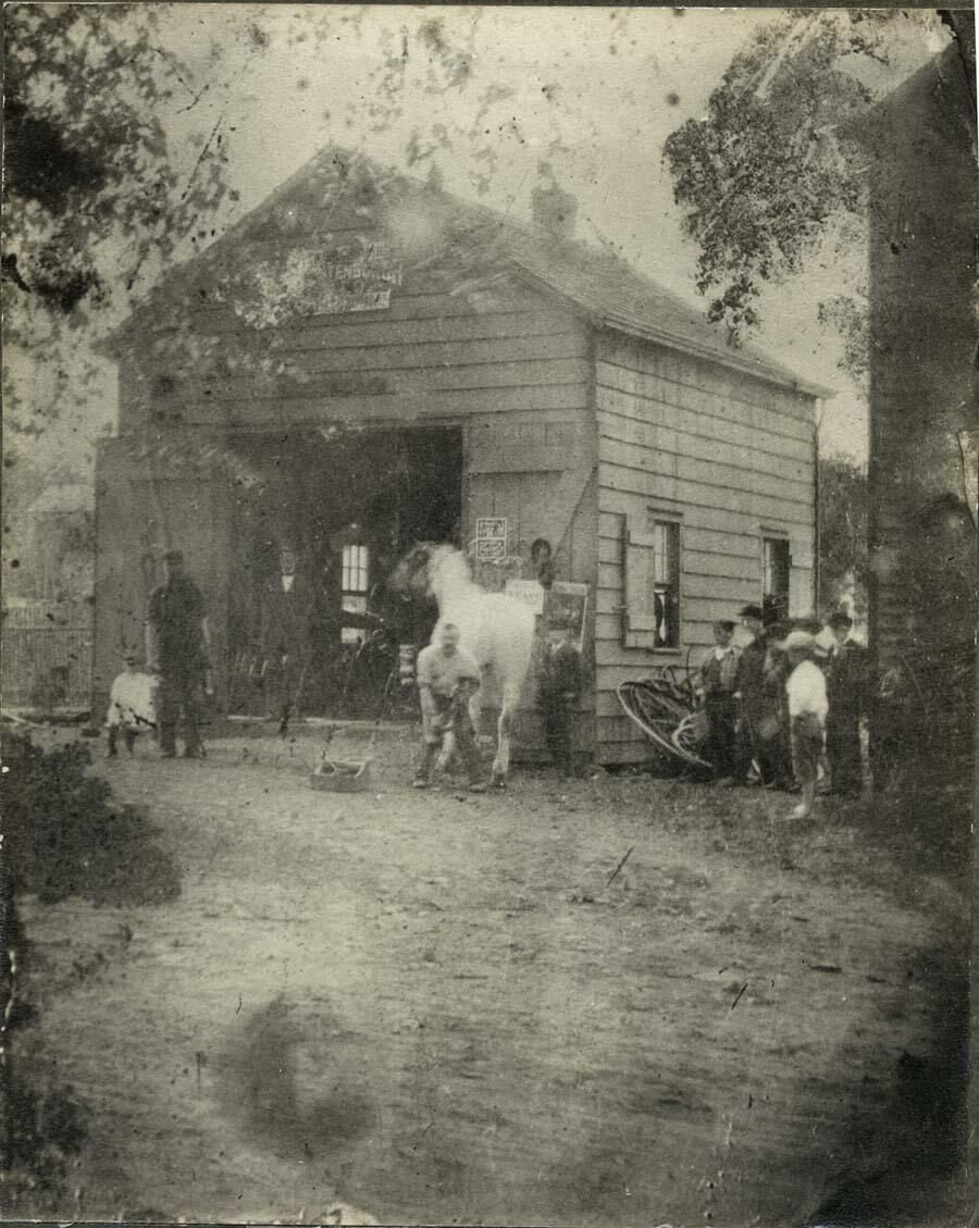 Original cardboard-mounted b/w photograph of Lonergan's blacksmith shop, then known as Prairie Rose. The actual photo measures 8" x 10" not including the cardboard backing. The cardboard is fragile and crumbling. There is a cellophane-like material surrounding the photo, which may be mounted on it. The age is just a guesstimate, based upon an ad in the Budget newspaper. The photo was purchased from Thomas McCloskey, former owner of the kitchen-design business, Sawhorse Designs, in the former building owned by a descendant known as Mrs. Longeran. Mr. McCloskey acquired the photo(s) from Mrs. Lonergan and all photos were purchased from Tom by the donor.Acquisition