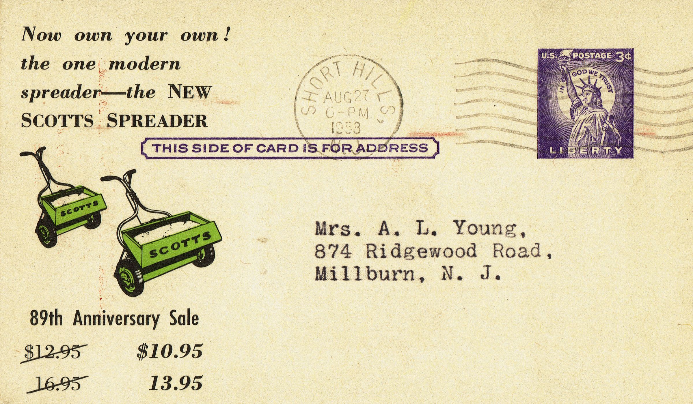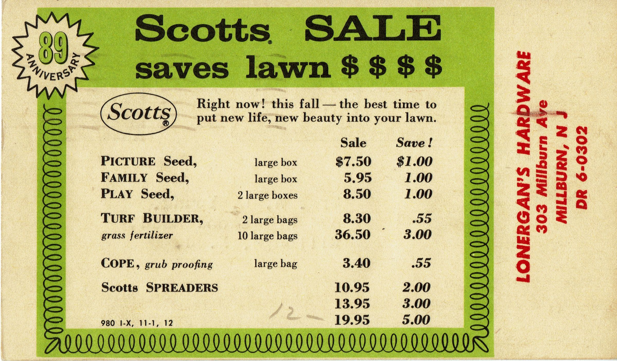 Postcard from Lonergan's Hardware, 303 Millburn Avenue advertising sales of Scotts lawn products in honor of the store's 89 year anniversary. The postcard is postmarked August 27, 1958.Acquisition