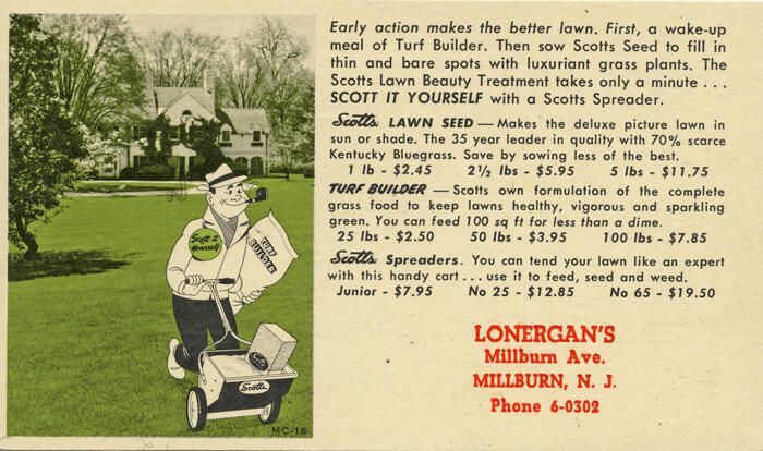 Ca. 1952 advertising postcard for Lonergan's on Millburn Avenue, "Phone 6-0302." The postally unused postcard advertised lawn care products on the front of the card and has a colorized photo of a house, superimposed on which is a sketch of a pipe-smoking man with a spreader. The address side of the card is printed with a one-cent postage mark, next to which is stamped "Revalued 2c P.O. Dept." The card is yellowed overall, but has no other obvious signs of damage. Purchased on eBay from Jonathan Topper; 8524 Highway 6 N; Ste. 237; Houston, TX 770952103."Acquisition