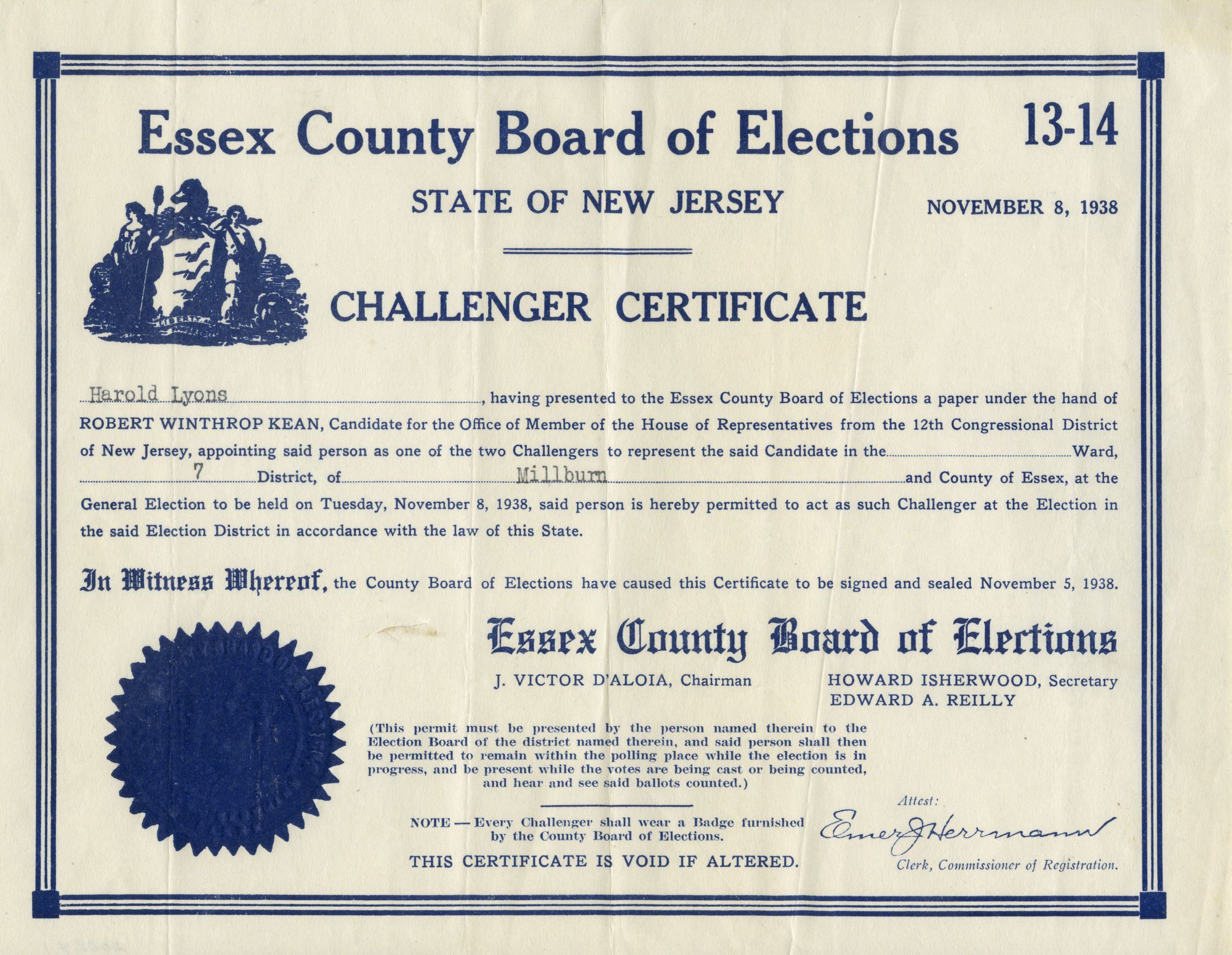 Essex County Board of Elections Challenger Certificate for Harold Lyons in his campaign in the 7th District of Millburn at the General Election on Tuesday, November 8, 1938.Acquisition