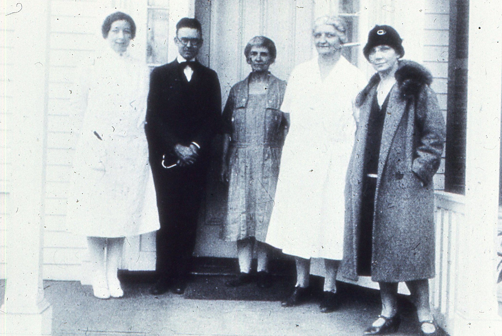 Photograph of the staff of Neighborhood House standing on the front porch in 1926. Pictured are: Mrs. Pfitzinger (Nurse), Dr. McPherson, Mrs. Flaherty (Assistant Matron), Mrs. Lown (Matron), Mrs. Hull (Executive Secretary). See: 1976.002.055 for Centennial Collection Image.Photograph Details