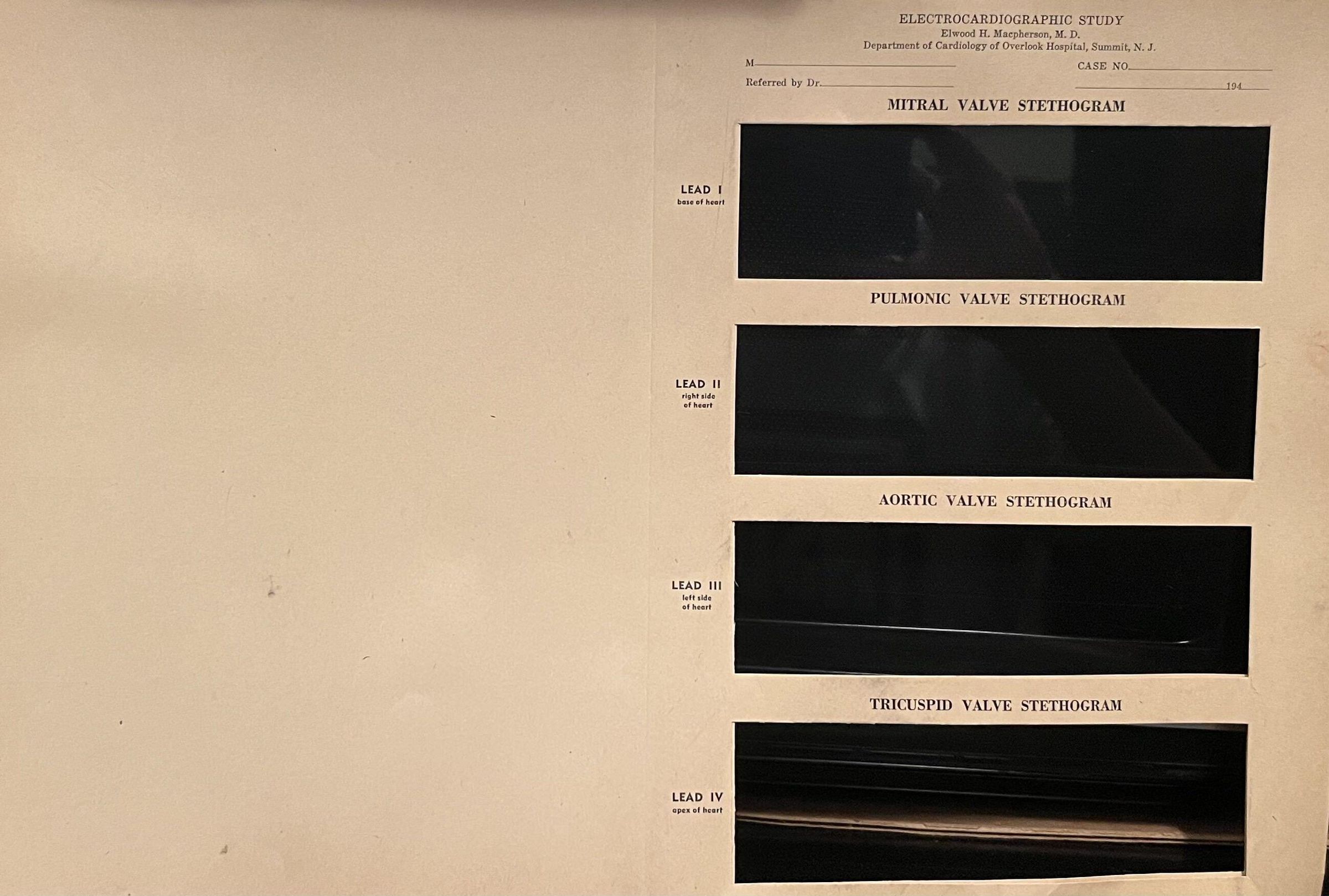 Electrocardiographic Study with places to put stethograms. Property of Elwood H. Macpherson, M.D. at the Department of Cardiology of Overlook Hospital, Summit, N.J.Collection