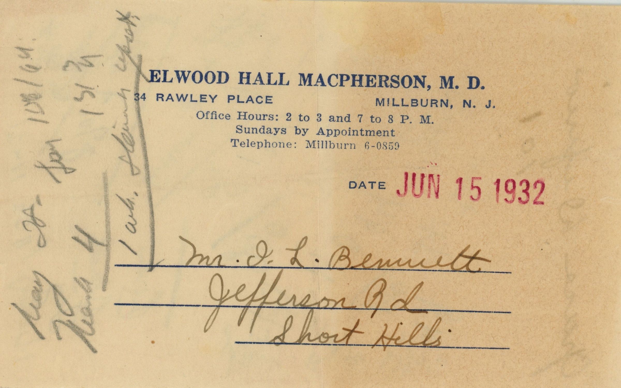 Office card for Elwood Hall Macpherson, M.D., 34 Rahway Place, Millburn, New Jersey dated June 15 1932. The card is addressed to Mr. J. L. Bennett, Jefferson Road, Short Hills and contains handwritten notes on both sides.Collection