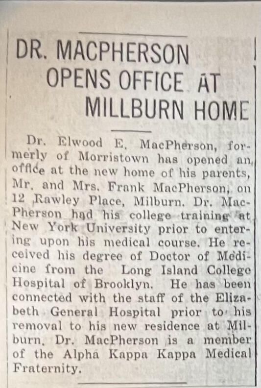 An article snippet about Dr. Macpherson opening an office in Millburn. Note: From back of 1925 diary of Elwood Macpherson.Collection