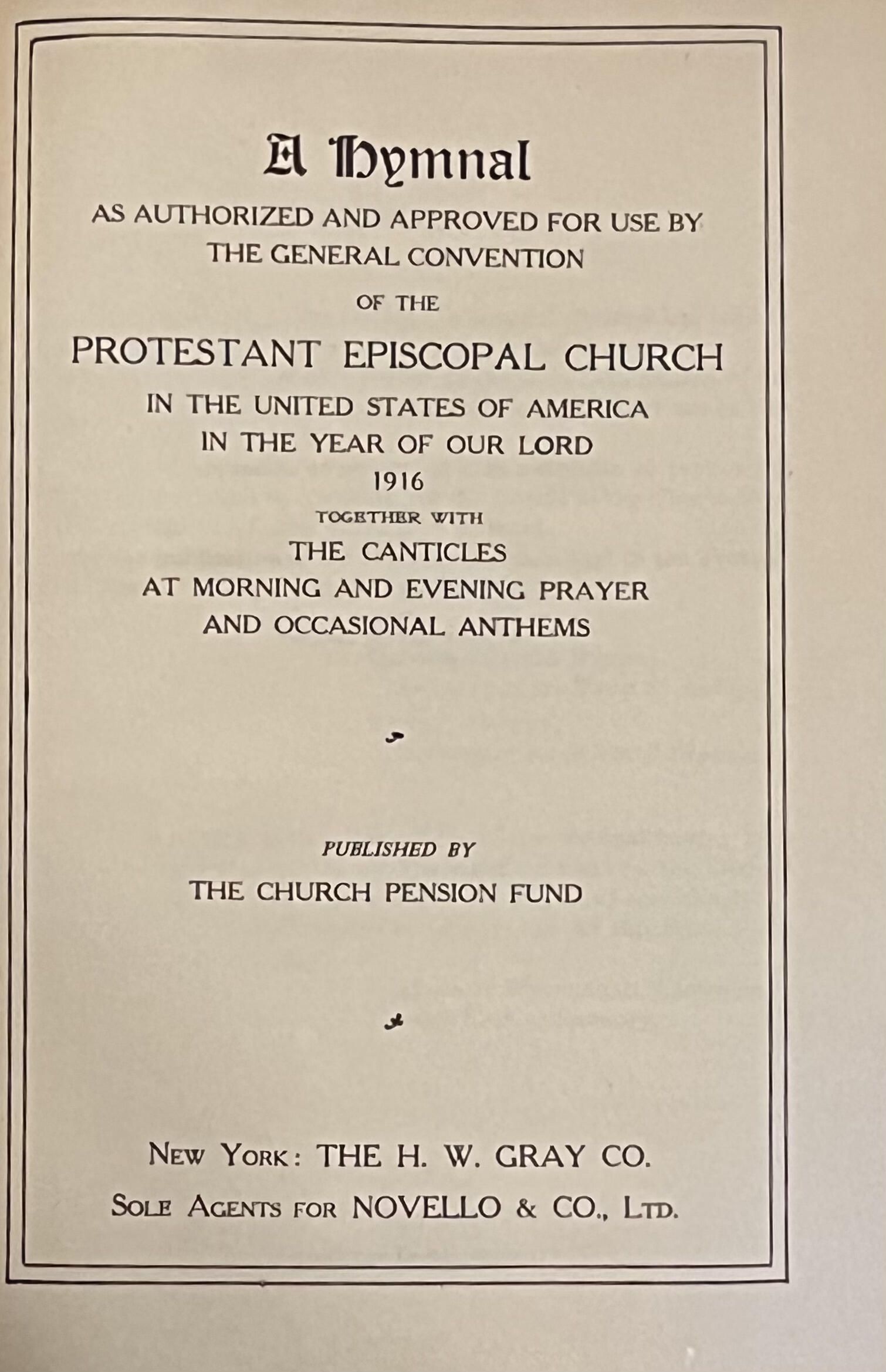 Church Pension Fund, "A Hymnal as Authorized and Approved for Use by the General Convention of the Protestant Episcopal Church in the United States of America in the Year of Our Lord 1916." New York: The H.W. Gray Co.Acquisition