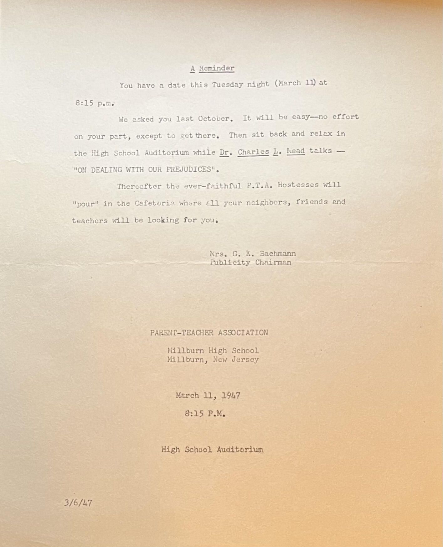 A reminder from the Millburn High School Parent-Teacher Association to Macpherson, regarding attending a meeting on March 11, 1947, 8:15 P.M.Published March 3, 1947.Collection