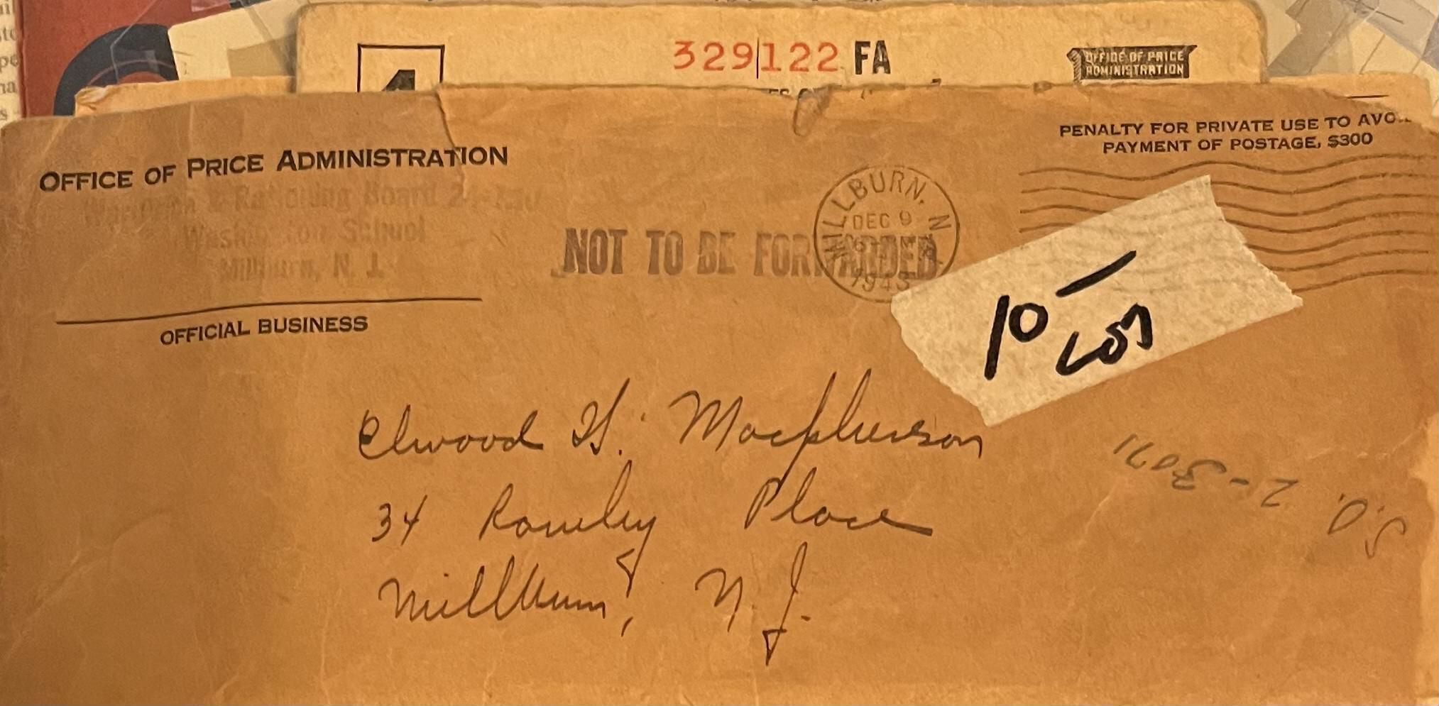 Envelope addressed to Elwood Macpherson, 34 Rawley Place, Millburn NJ, containing war ration books around the 1940s. Postmarked 1943.Acquisition