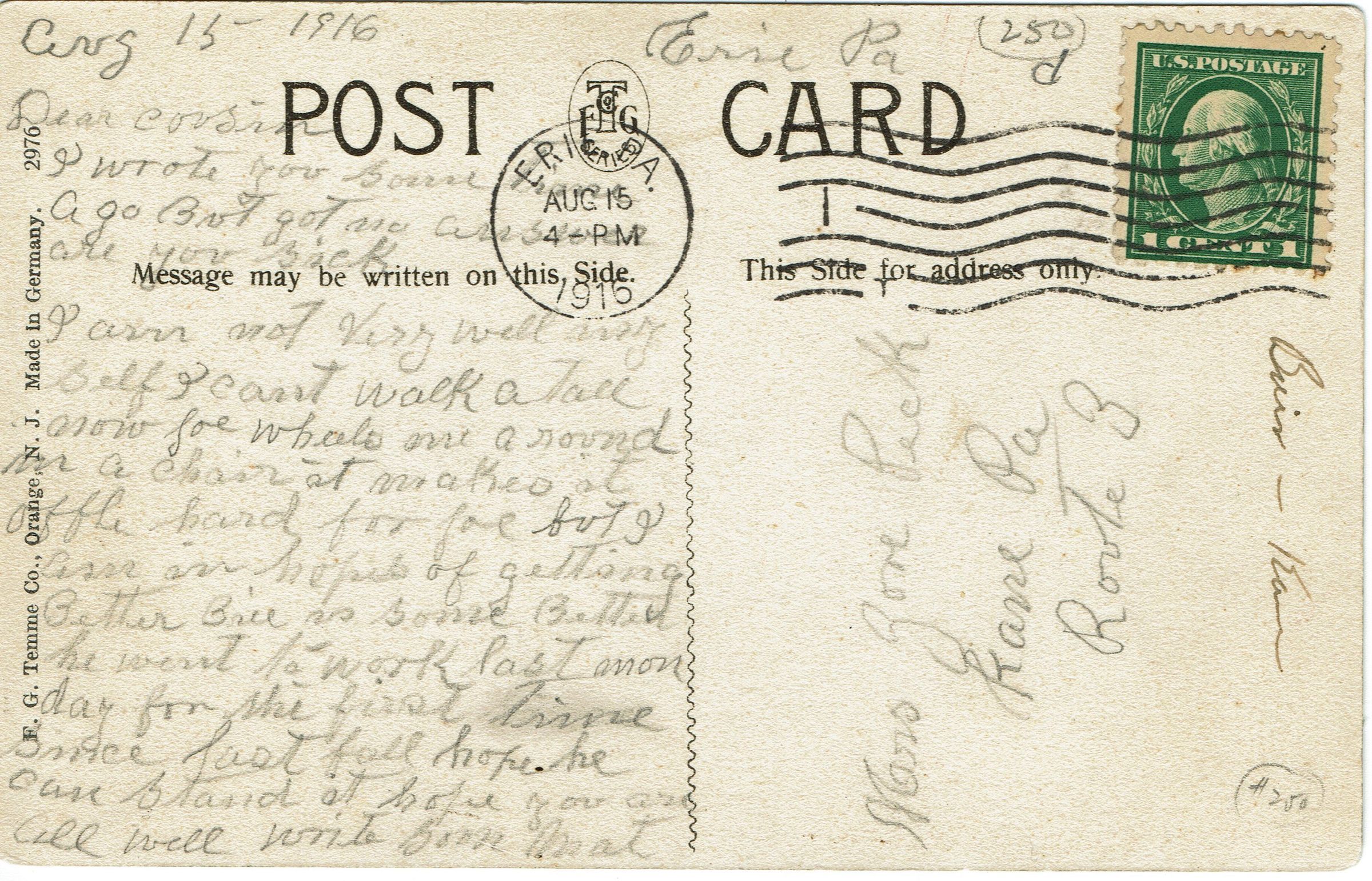 Postmarked Erie PA, August 15, 1916 4 pm and addressed to Mrs. Gore Peck, Kane PA, Route 3.Collection